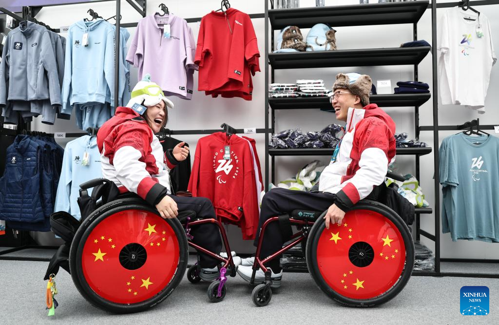 Chen Jianxin (R) and Li Nana of China select souvenir in the official store at the Paralympic Village of the Milan-Cortina 2026 Paralympic Winter Games in Cortina d'Ampezzo, Italy, March 3, 2026. (Xinhua/Wang Kaiyan)
