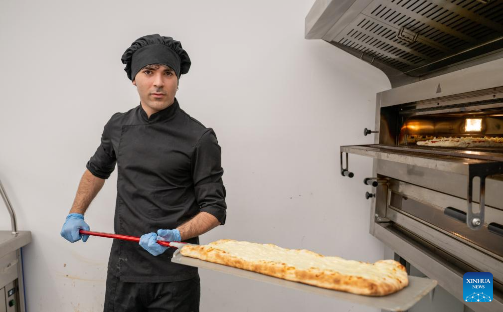 A chef shows off the pizza he makes at the Paralympic Village of the Milan-Cortina 2026 Paralympic Winter Games in Cortina d'Ampezzo, Italy, March 3, 2026. (Xinhua/Lian Zhen)
