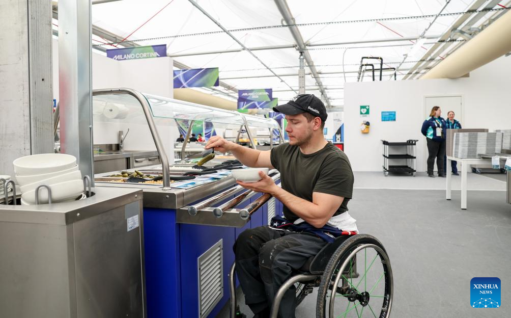 An athlete selects food in the dining hall at the Paralympic Village of the Milan-Cortina 2026 Paralympic Winter Games in Cortina d'Ampezzo, Italy, March 3, 2026. (Xinhua/Wang Kaiyan)