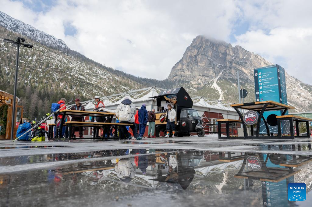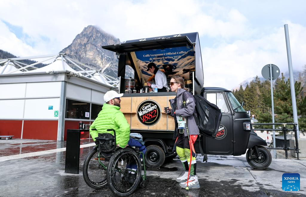 People chat at a coffee truck at the Paralympic Village of the Milan-Cortina 2026 Paralympic Winter Games in Cortina d'Ampezzo, Italy, March 3, 2026. (Xinhua/Wang Kaiyan)