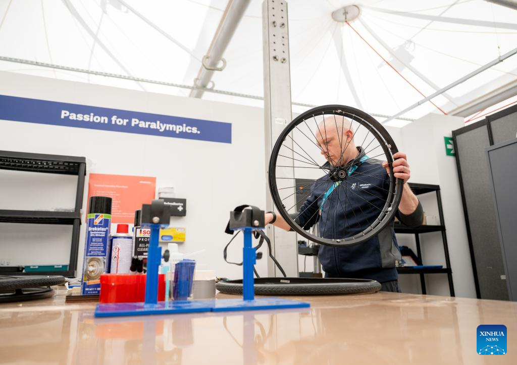 A staff member repairs wheelchair in the repair service center at the Paralympic Village of the Milan-Cortina 2026 Paralympic Winter Games in Cortina d'Ampezzo, Italy, March 3, 2026. (Xinhua/Lian Zhen)
