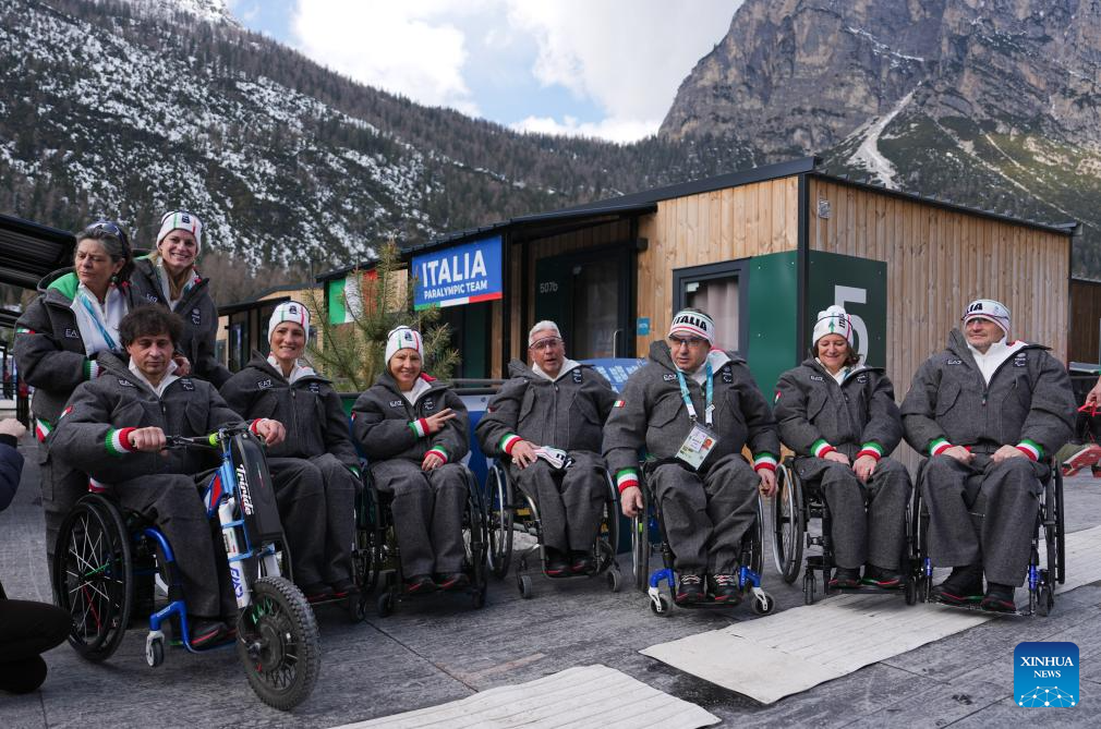 Athletes pose for photos at the Paralympic Village of the Milan-Cortina 2026 Paralympic Winter Games in Cortina d'Ampezzo, Italy, March 3, 2026. (Xinhua/Cai Yang)