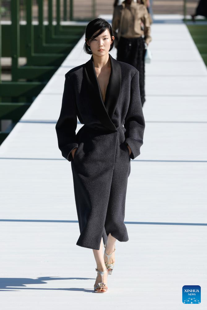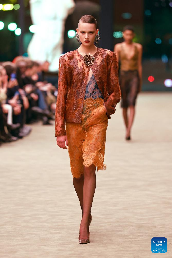 A model presents a creation from the ready-to-wear Fall/Winter 2026-2027 collections by Saint Laurent during the Paris Fashion Week in Paris, France, on March 3, 2026. (MeetEurope/Handout via Xinhua)