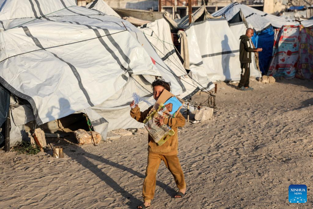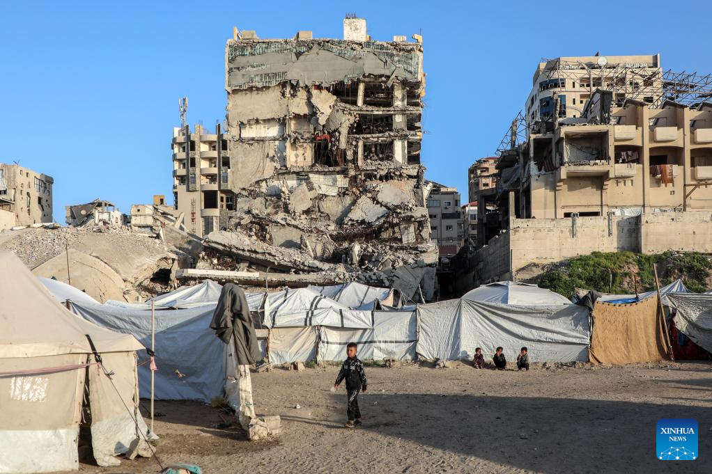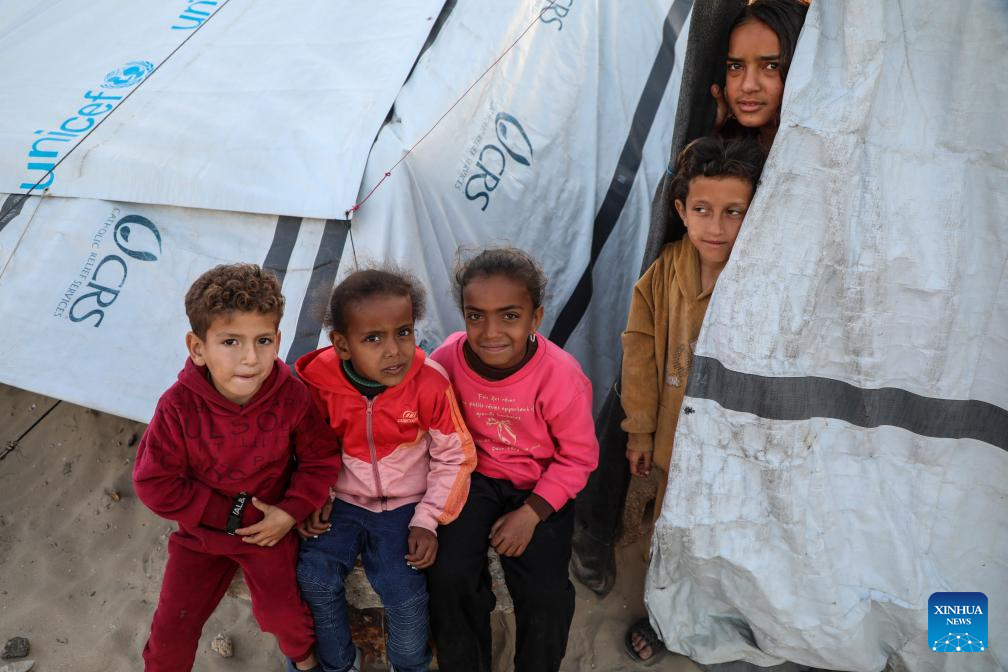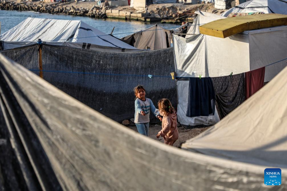 Displaced Palestinian children are pictured among temporary tents in the west of Gaza City on March 3, 2026. (Photo by Rizek Abdeljawad/Xinhua)