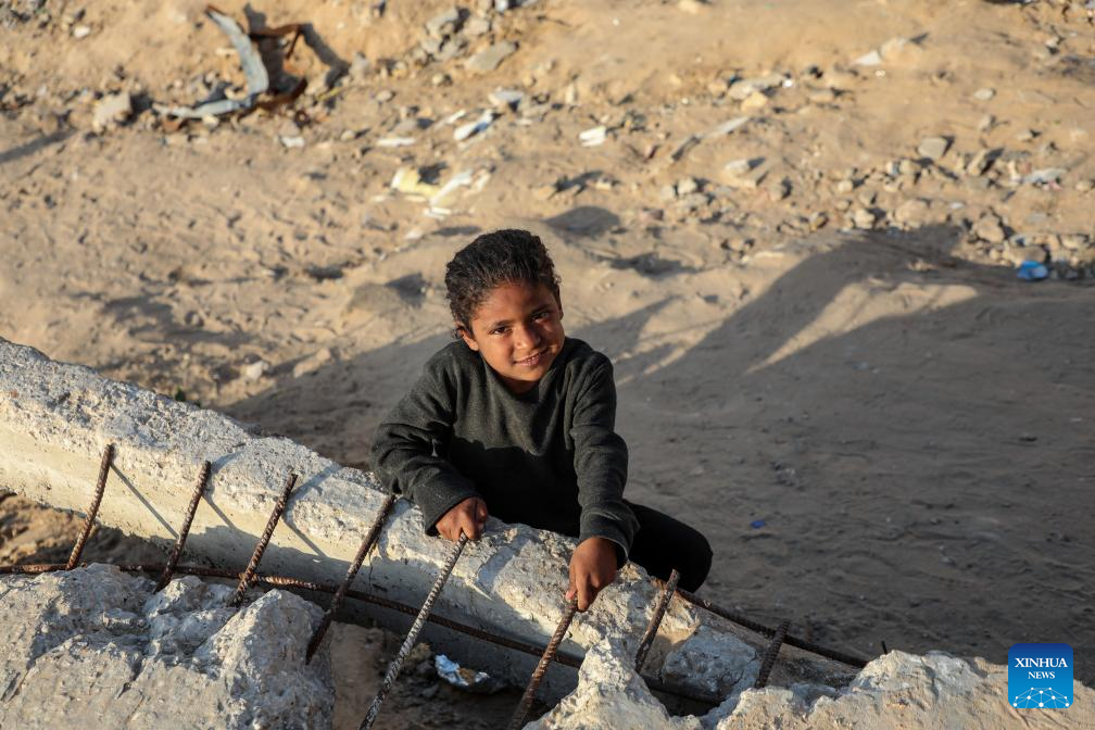 A displaced Palestinian child is pictured among temporary tents in the west of Gaza City on March 3, 2026. (Photo by Rizek Abdeljawad/Xinhua)