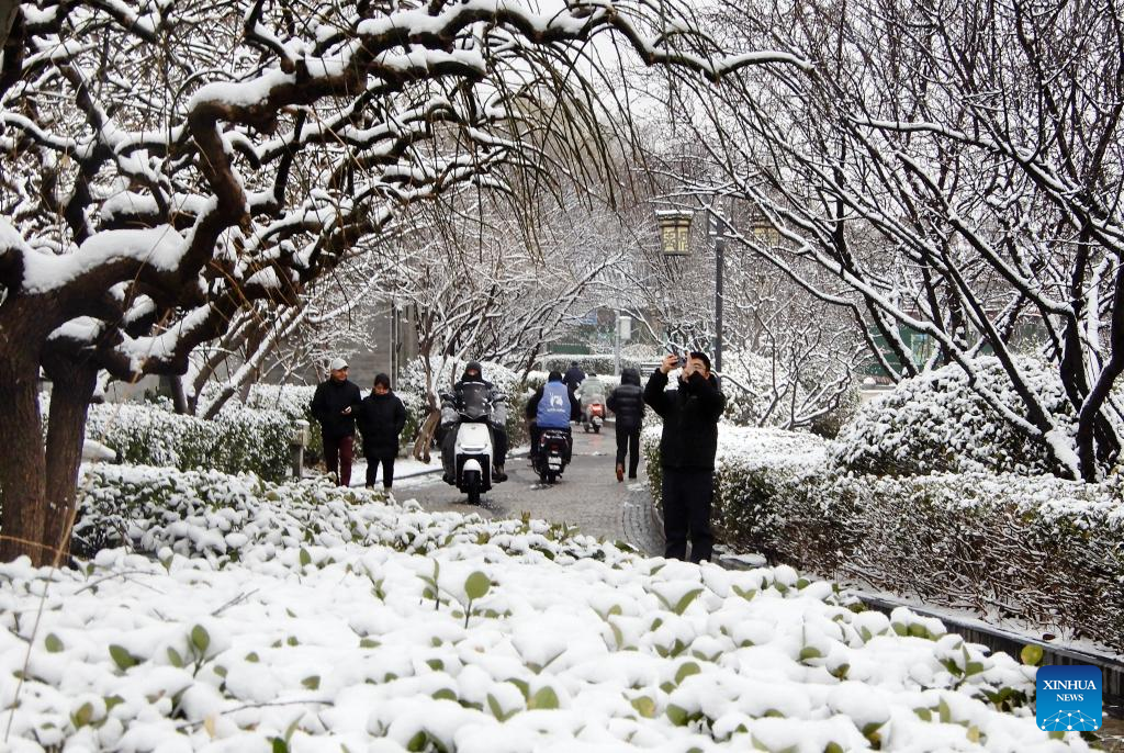 Citizens walk on a street in Beijing, capital of China, on March 5, 2026. Beijing has witnessed a spring snowfall from Wednesday to Thursday. (Xinhua/Li Xin)