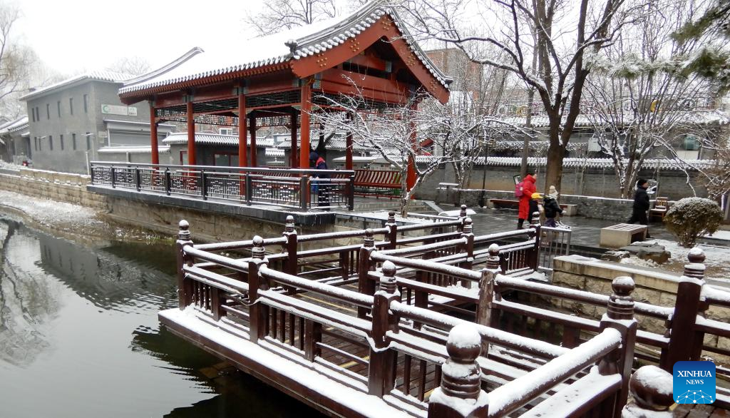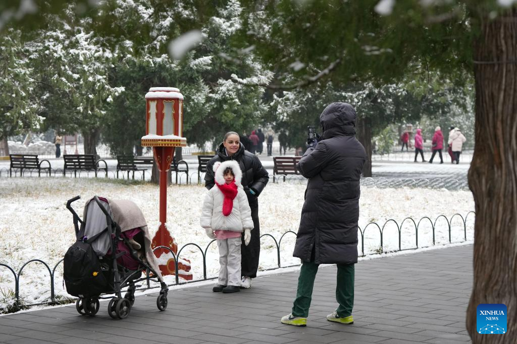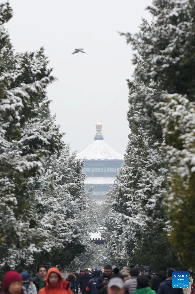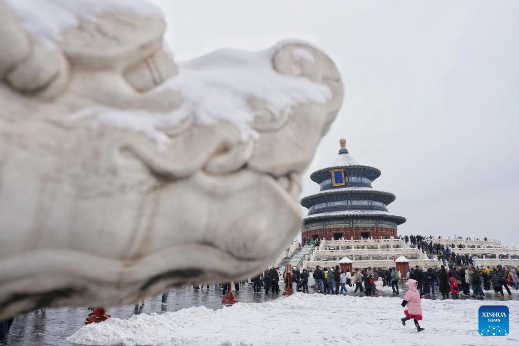 Tourists visit the Tiantan (Temple of Heaven) Park in Beijing, capital of China, March 5, 2026. Beijing has witnessed a spring snowfall from Wednesday to Thursday. (Xinhua/Ju Huanzong)