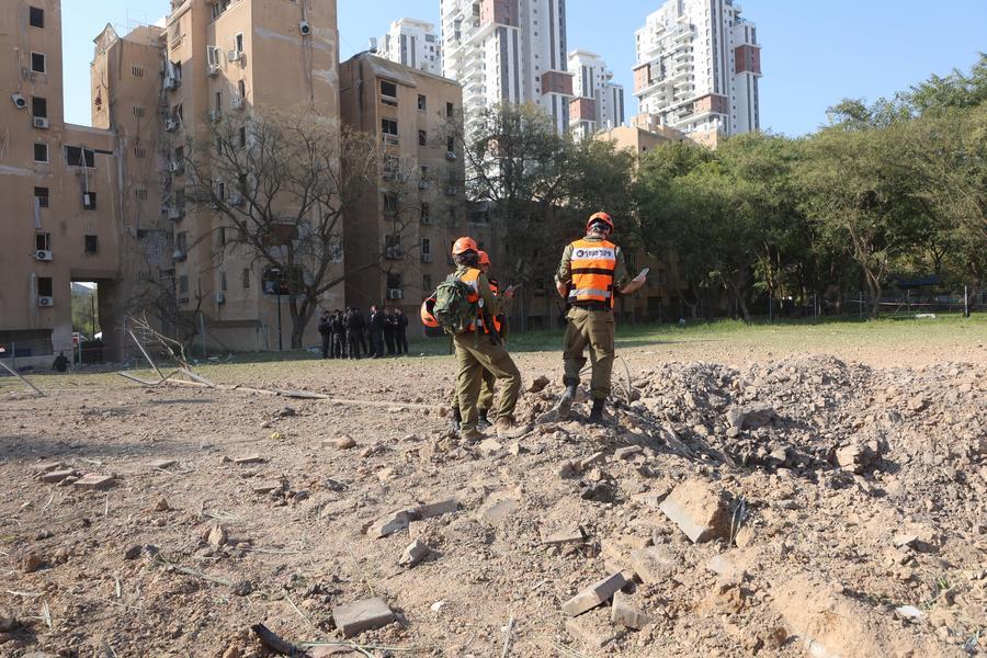 Members of the Israeli security and rescue forces work at the scene where a ballistic missile fired from Iran hit and caused damage in Tel Aviv, Israel, early on March 1, 2026. (Gideon Markowicz/JINI via Xinhua)