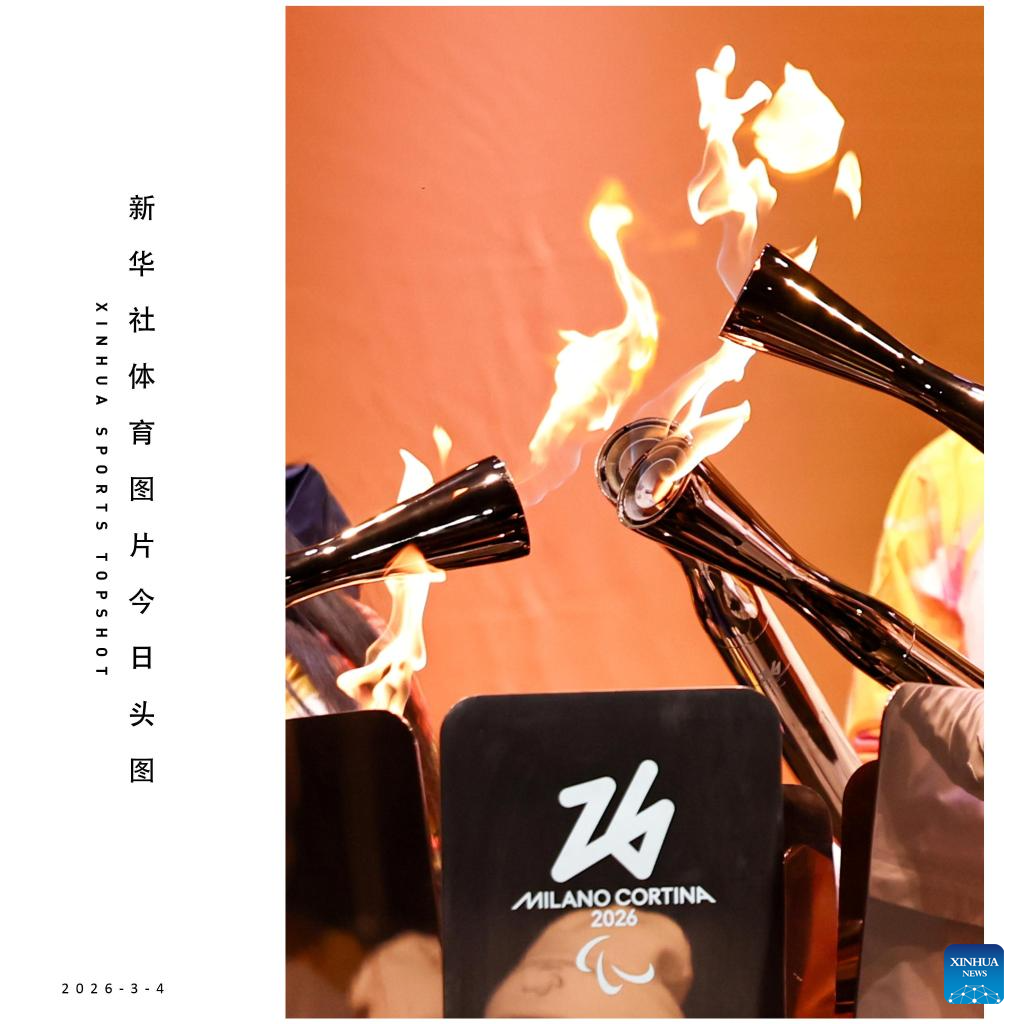 Torchbearers unify the flame during the Milan-Cortina 2026 Paralympic Winter Games Torch Relay and Flame Unifying Ceremony in Cortina D'Ampezzo, Italy, March 3, 2026. (Xinhua/Wang Kaiyan)