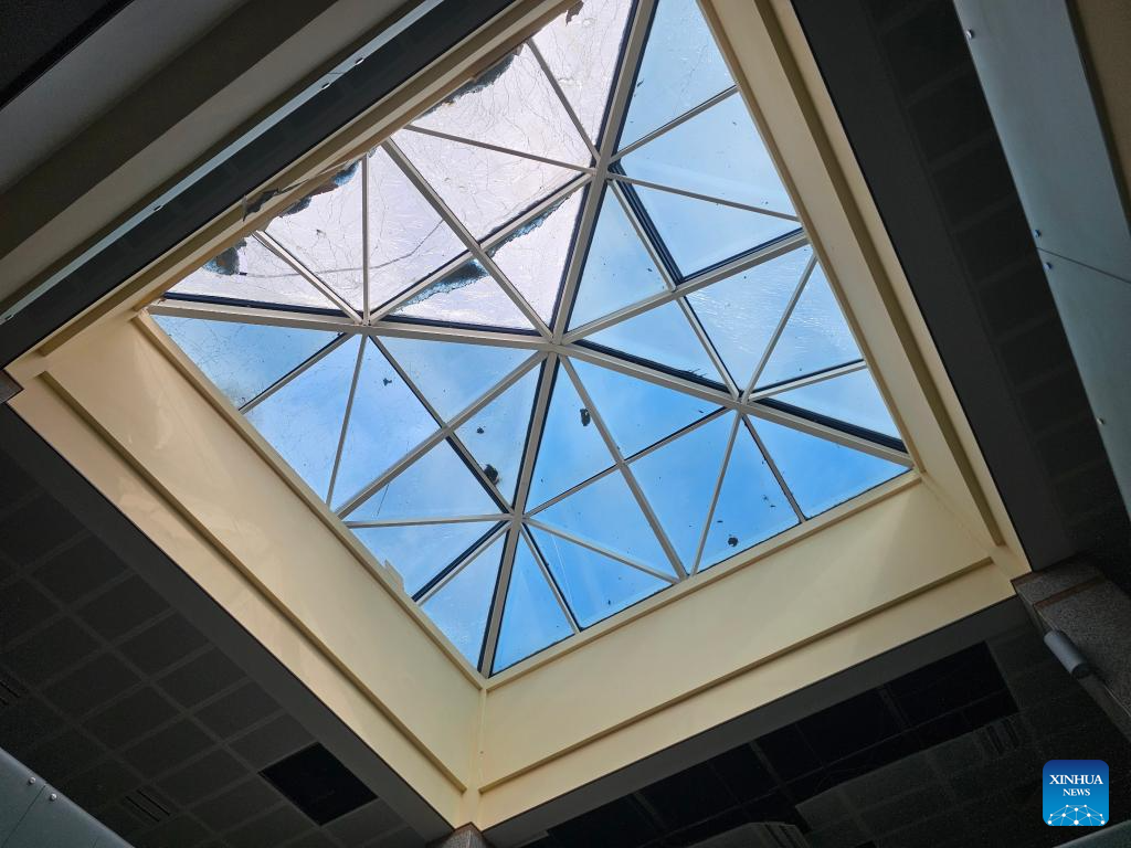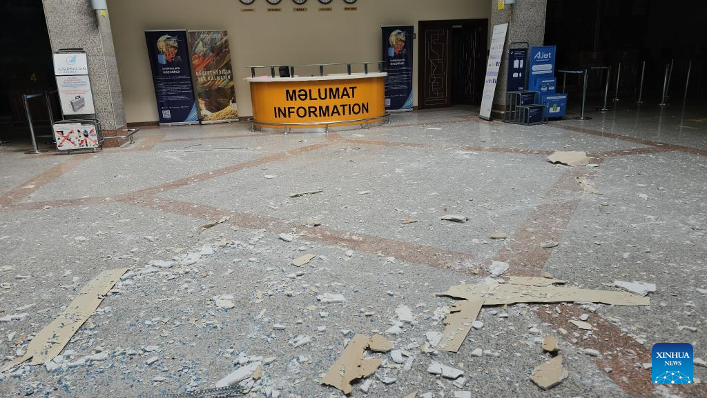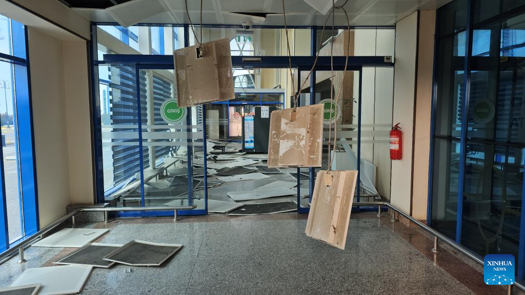 This photo taken with a mobile phone shows the damage inside a building at Nakhchivan International Airport in Nakhchivan Autonomous Republic, March 5, 2026. (Azerbaijan State News Agency/Handout via Xinhua)
