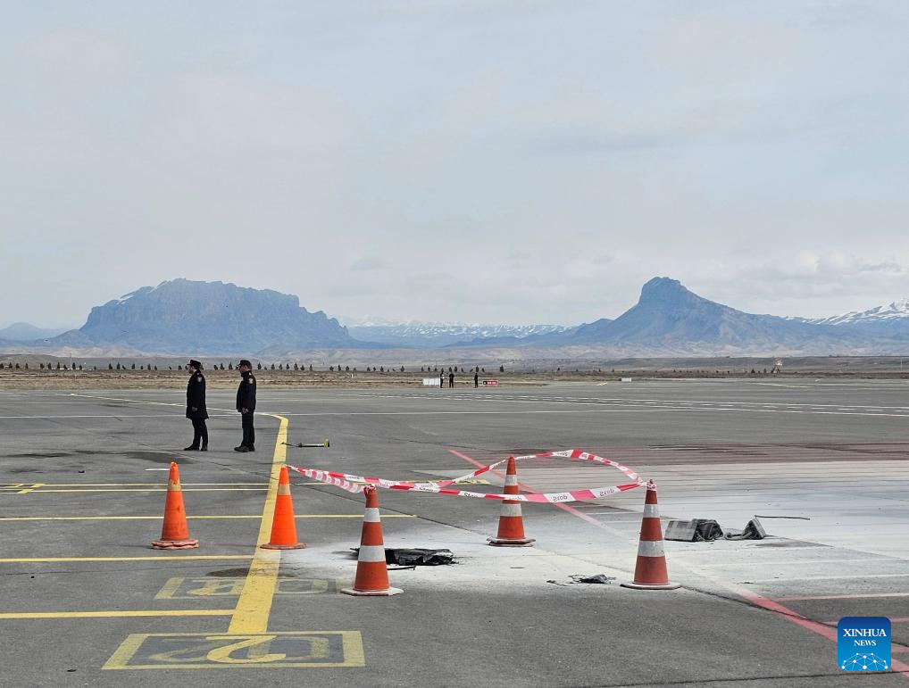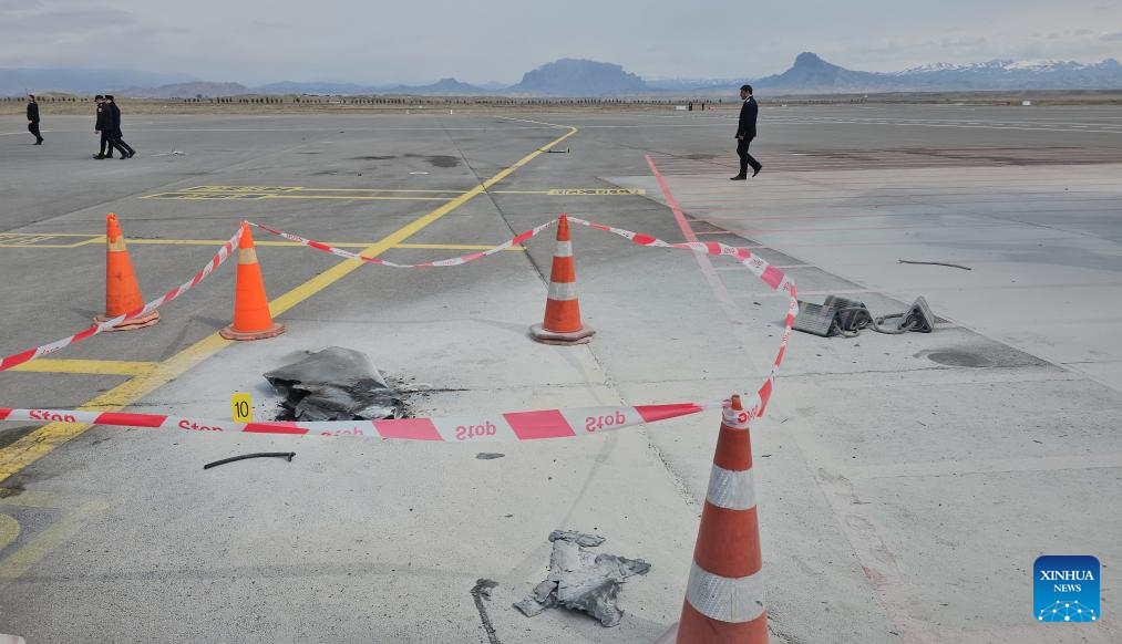 This photo taken with a mobile phone shows debris of a drone at Nakhchivan International Airport in Nakhchivan Autonomous Republic, March 5, 2026. (Azerbaijan State News Agency/Handout via Xinhua)
