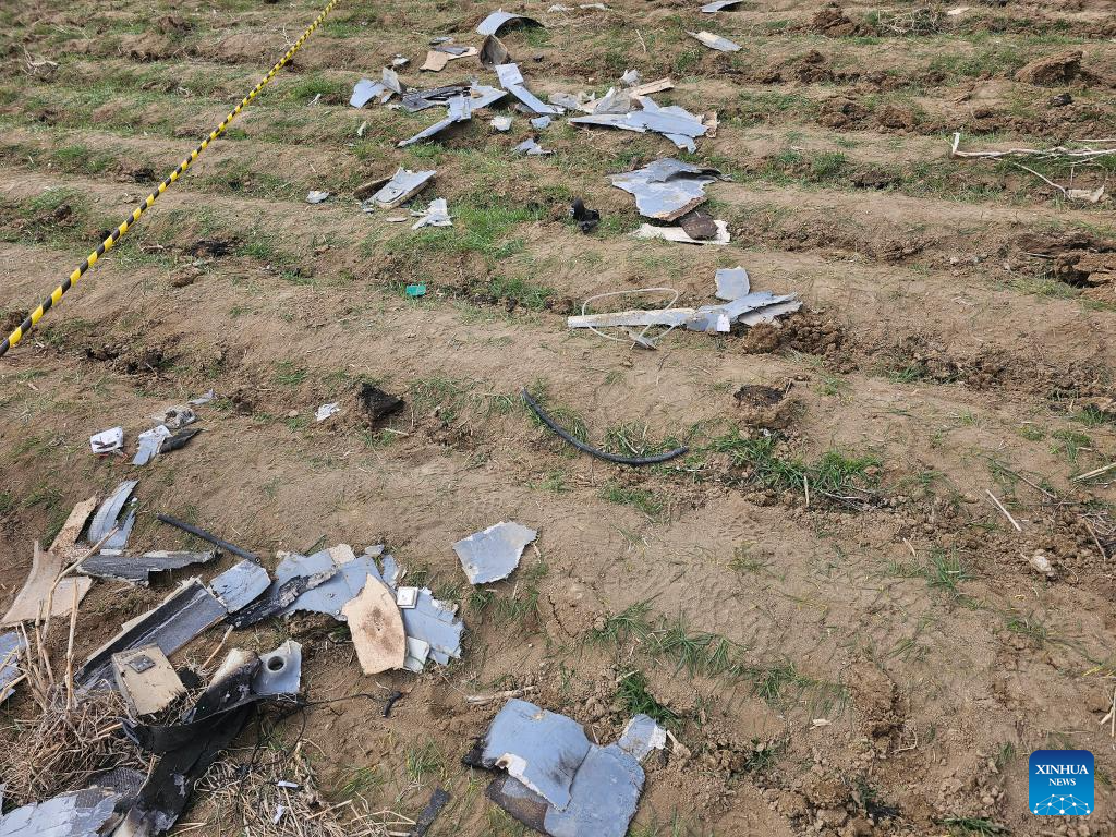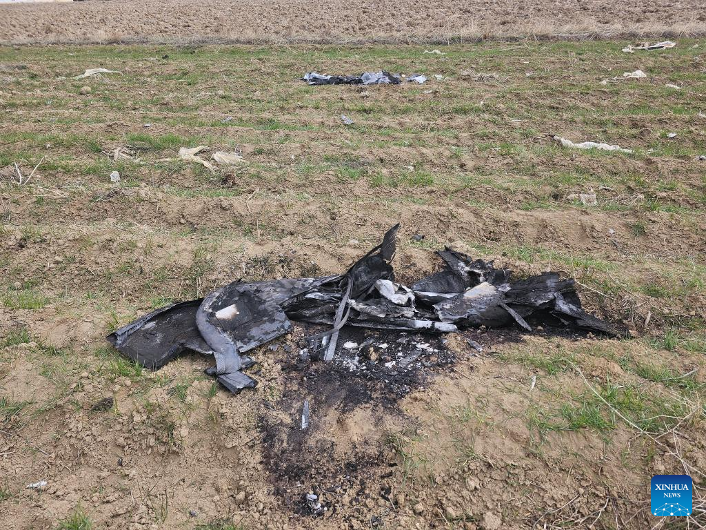 This photo taken with a mobile phone shows debris of a drone near a school in Nakhchivan Autonomous Republic, March 5, 2026. The Azerbaijani Foreign Ministry on Thursday strongly condemned drone attacks on its Nakhchivan Autonomous Republic launched from Iranian territory, calling the strikes a "violation of the norms and principles of international law." The attacks took place at around midday on Thursday. One drone struck the terminal building at Nakhchivan International Airport, injuring two civilians and causing structural damage, while another drone fell near a school in the village of Shakarabad, the ministry said in a statement. The ministry said the actions would escalate regional tensions and directly contradict the principles of international law. Nakhchivan is an Azerbaijani exclave separated from the rest of the country by Armenia and bordering Armenia, Iran and Türkiye. (Azerbaijan State News Agency/Handout via Xinhua)