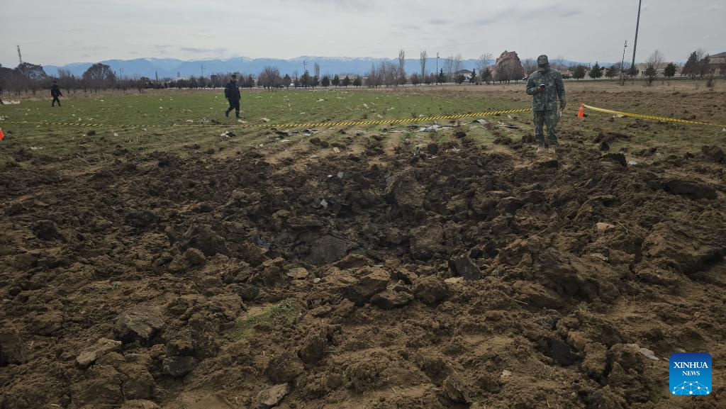 This photo taken with a mobile phone shows a crater caused by a drone strike near a school in Nakhchivan Autonomous Republic, March 5, 2026.(Azerbaijan State News Agency/Handout via Xinhua)