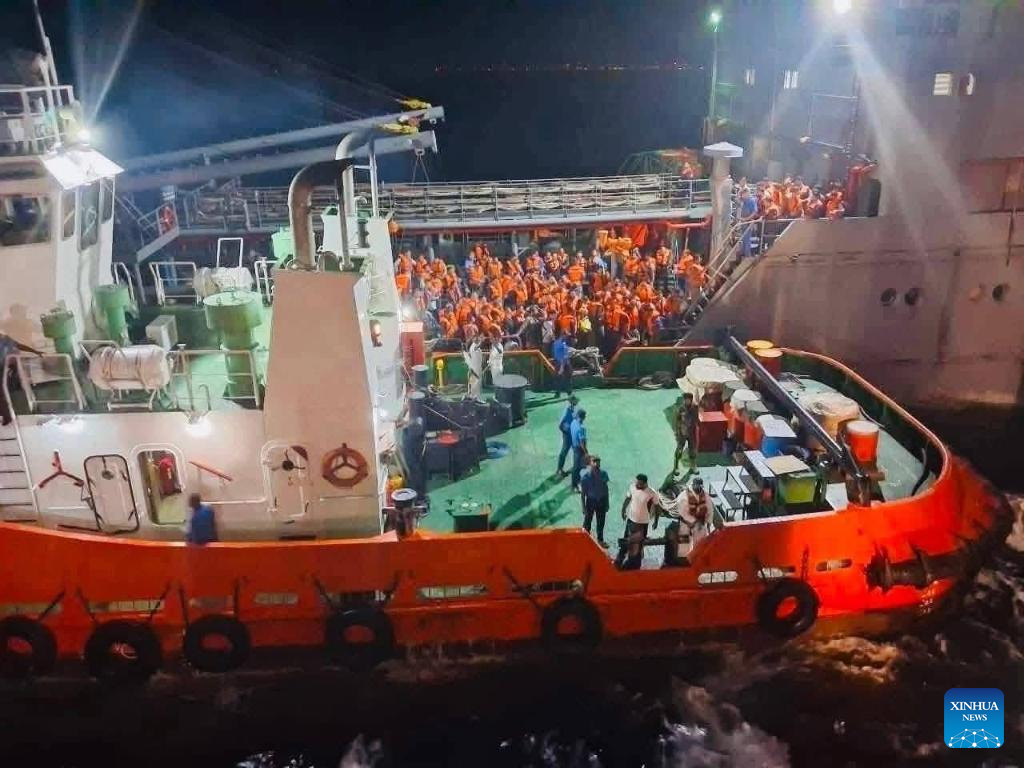 People from the Iranian naval vessel IRIS Bushehr are evacuated to Colombo Port, Sri Lanka, March 5, 2026. A total of 204 people from IRIS Bushehr have been brought to Colombo Port, the Sri Lanka Navy said on Friday. IRIS Bushehr is an Iranian naval vessel which had taken part in a 2026 International Fleet Review, a cooperative maritime exercise held in India along with IRIS Dena, which sank off the island's southern coast after a U.S. submarine attack on Wednesday. The vessel sought permission to enter Sri Lanka a few days ago, and President Anura Kumara Dissanayake said the government decided to grant entry on humanitarian grounds. (Xinhua)