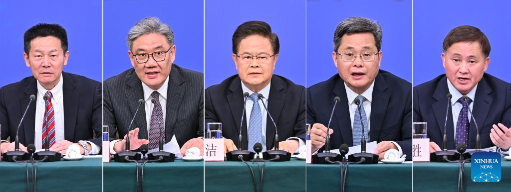 This combo photo shows Zheng Shanjie (C), head of the National Development and Reform Commission, Chinese Finance Minister Lan Fo'an (2nd R), Chinese Commerce Minister Wang Wentao (2nd L), Pan Gongsheng (1st R), governor of the People's Bank of China, and Wu Qing (1st L), chairman of the China Securities Regulatory Commission, attending a press conference for the fourth session of the 14th National People's Congress (NPC) on economy in Beijing, capital of China, March 6, 2026. (Xinhua/Li Xin)