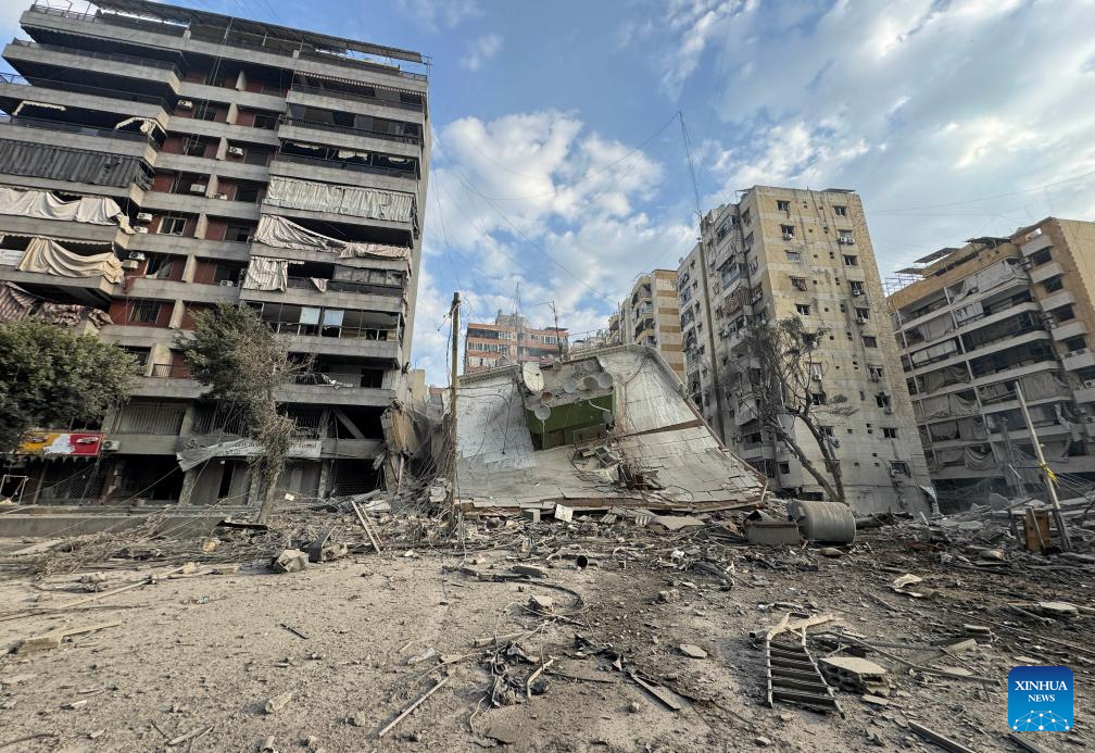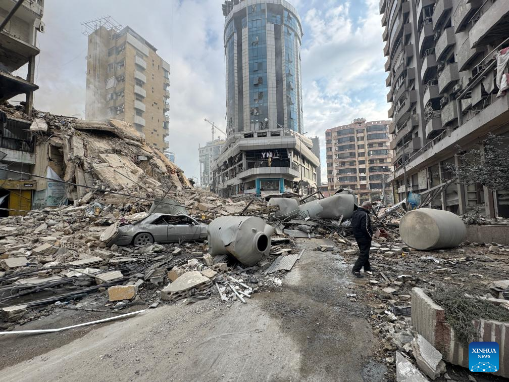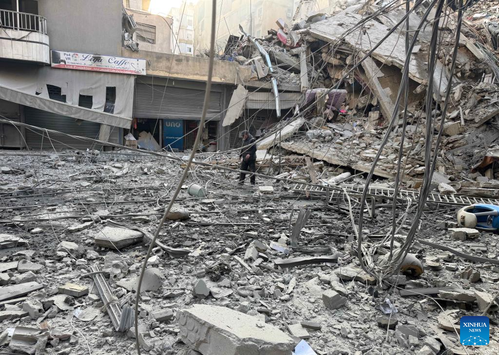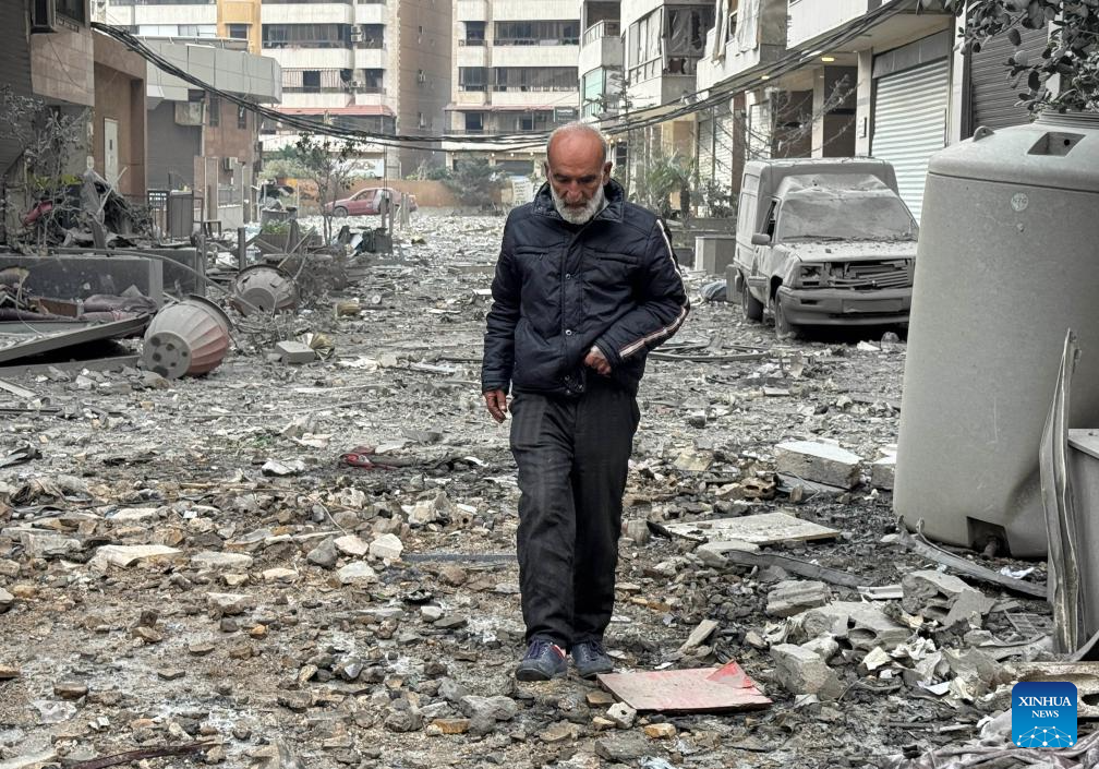 A man walks among the rubble after Israeli attacks in the southern suburbs of Beirut, Lebanon, March 7, 2026. The number of displaced people registered through Lebanon's government relief platform has reached about 454,000, Minister of Social Affairs Haneen Sayed said on Saturday, as Israel continues to attack several areas of the country. The death toll from Israeli attacks on Lebanon since early Monday has risen to 294, with 1,023 people injured, Lebanon's authorities said Saturday. (Photo by Bilal Jawich/Xinhua)