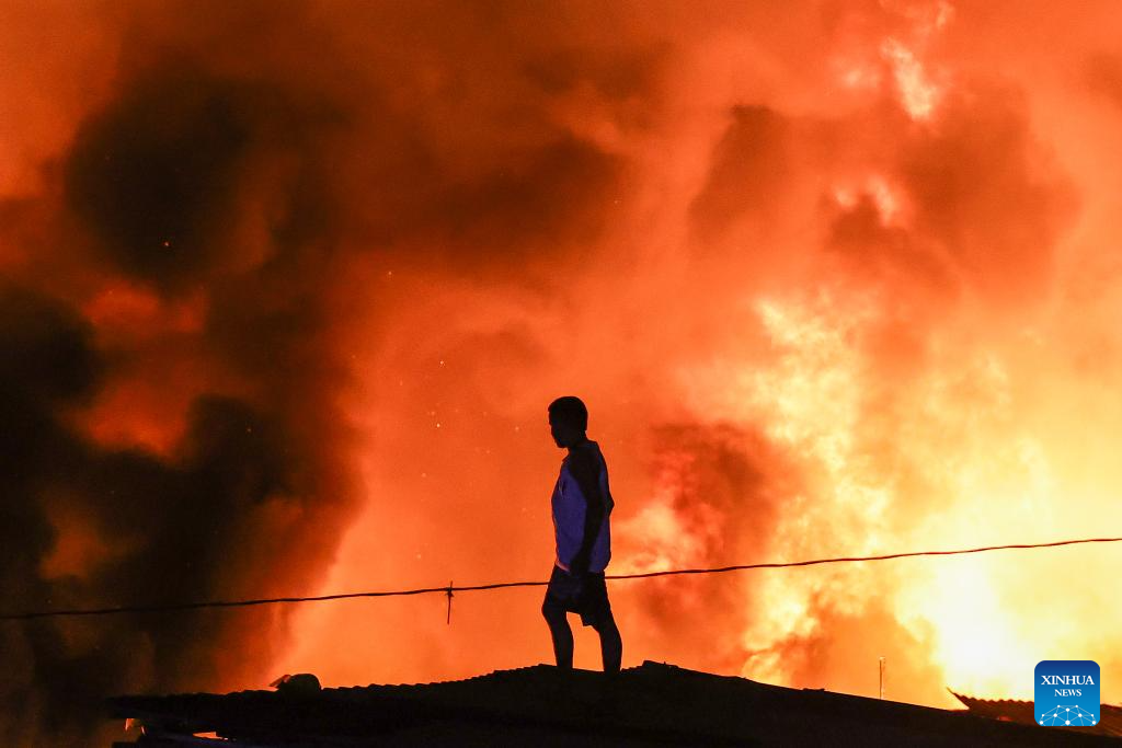 A resident is seen on the rooftop as a huge fire engulfs rows of shanties at a slum area in Quezon City, the Philippines, on March 6, 2026. (Xinhua/Rouelle Umali)