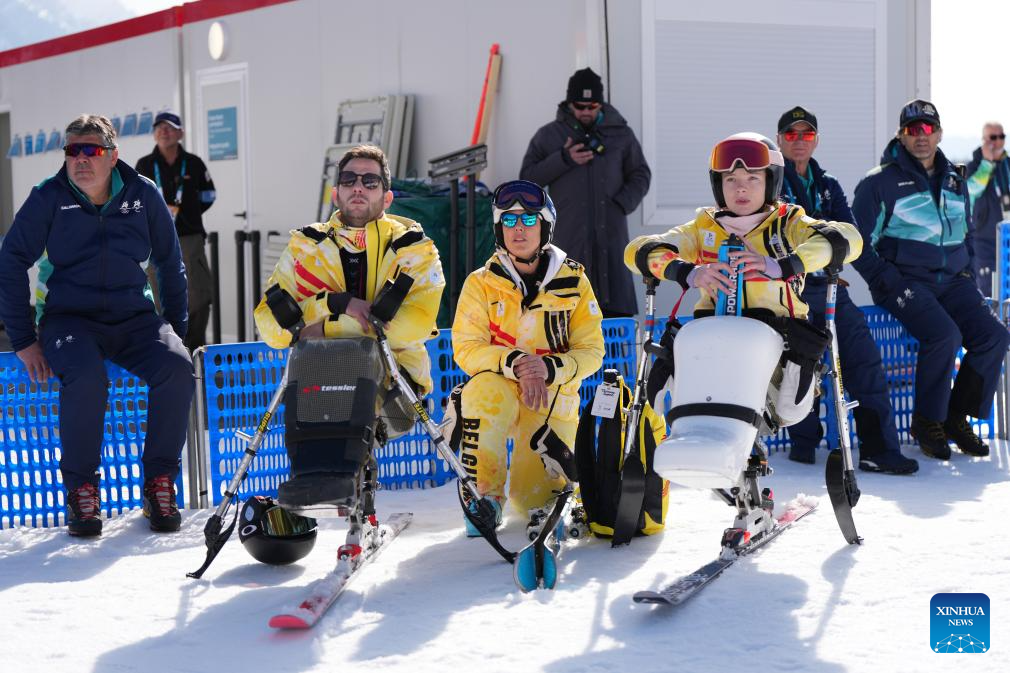 Players of Belgium watch the para alpine skiing women's downhill sitting match at the Milan-Cortina 2026 Paralympic Winter Games in Cortina D'ampezzo, Italy, March 7, 2026. (Xinhua/Wang Kaiyan)
