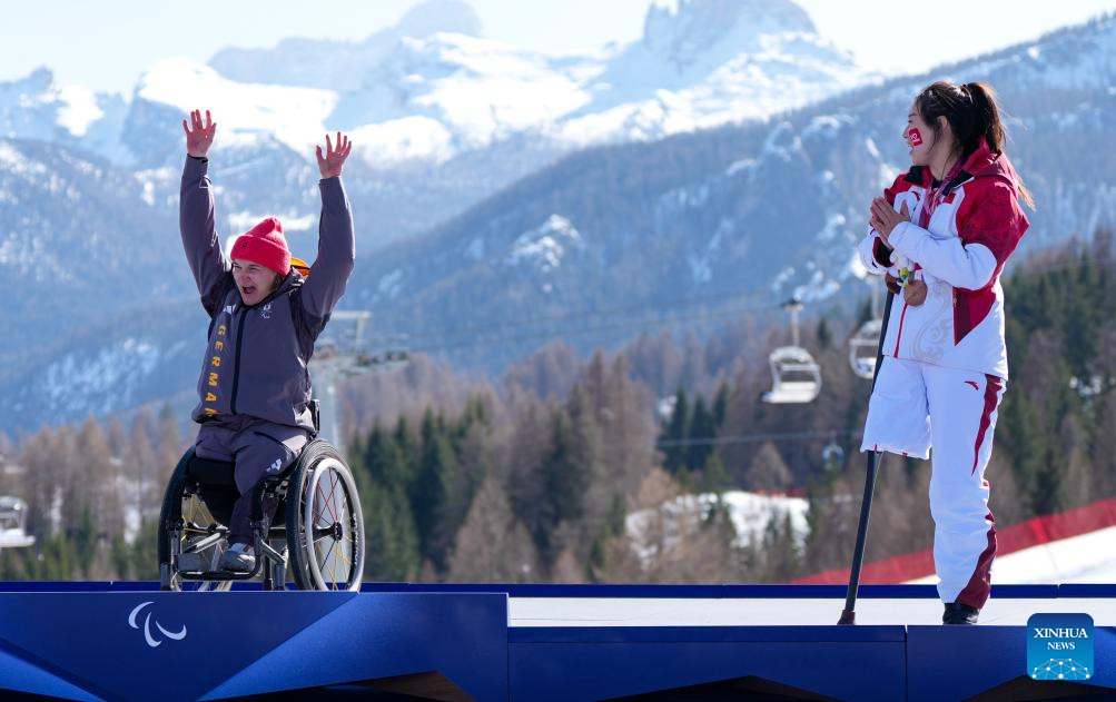 Liu Sitong (R) of China congratulates Anna-Lena Forster of Germany during awarding ceremony for the para alpine skiing women's downhill sitting match at the Milan-Cortina 2026 Paralympic Winter Games in Cortina D'ampezzo, Italy, March 7, 2026. (Xinhua/Wang Kaiyan)