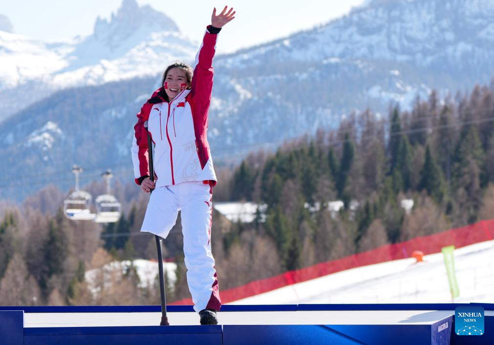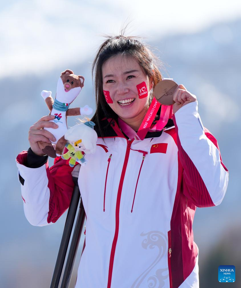 Liu Sitong of China celebrates during awarding ceremony for the para alpine skiing women's downhill sitting match at the Milan-Cortina 2026 Paralympic Winter Games in Cortina D'ampezzo, Italy, March 7, 2026. (Xinhua/Wang Kaiyan)