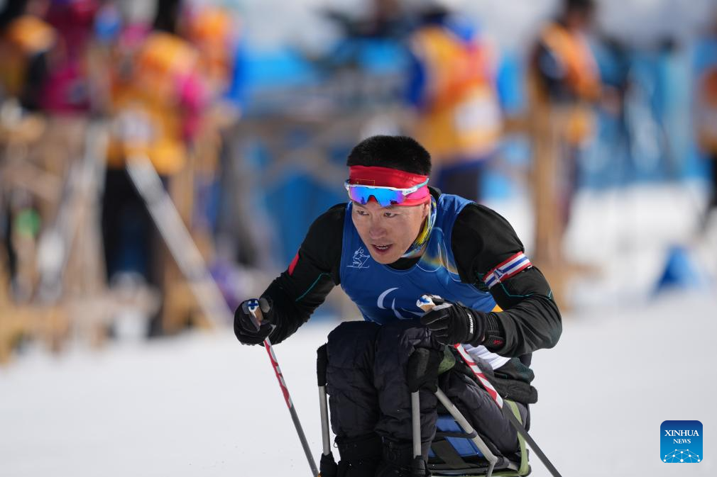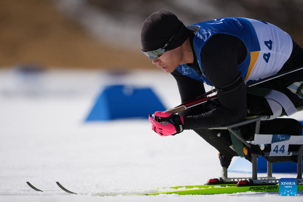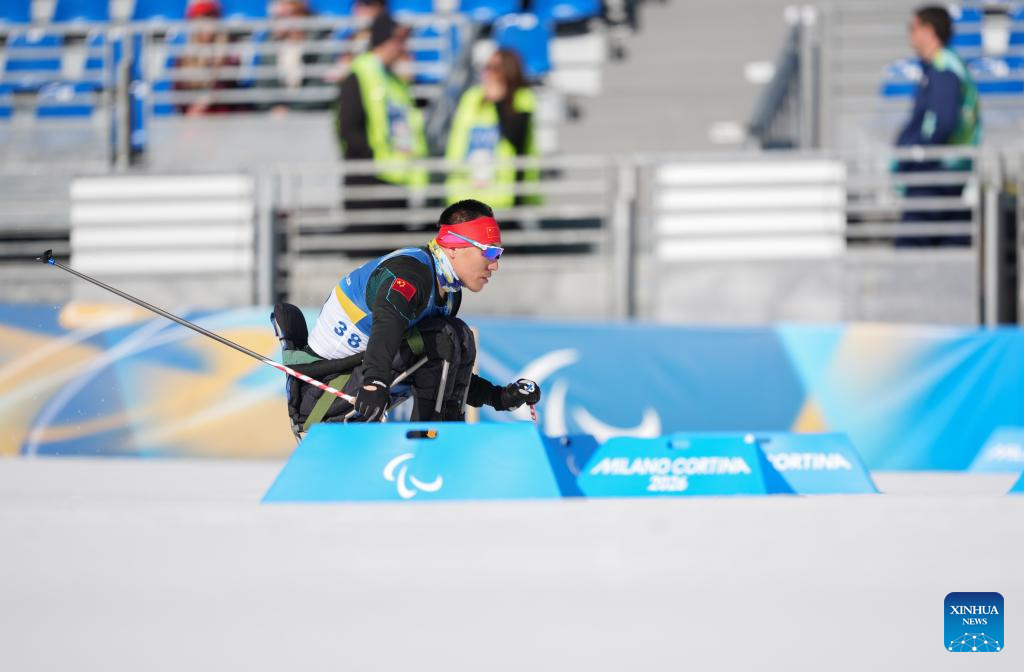 Liu Zixu of China competes during the men's individual sitting final of para biathon at the Milan-Cortina 2026 Paralympic Winter Games in Tesero, Italy, March 8, 2026. (Xinhua/Lian Zhen)