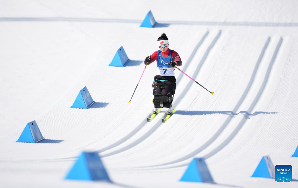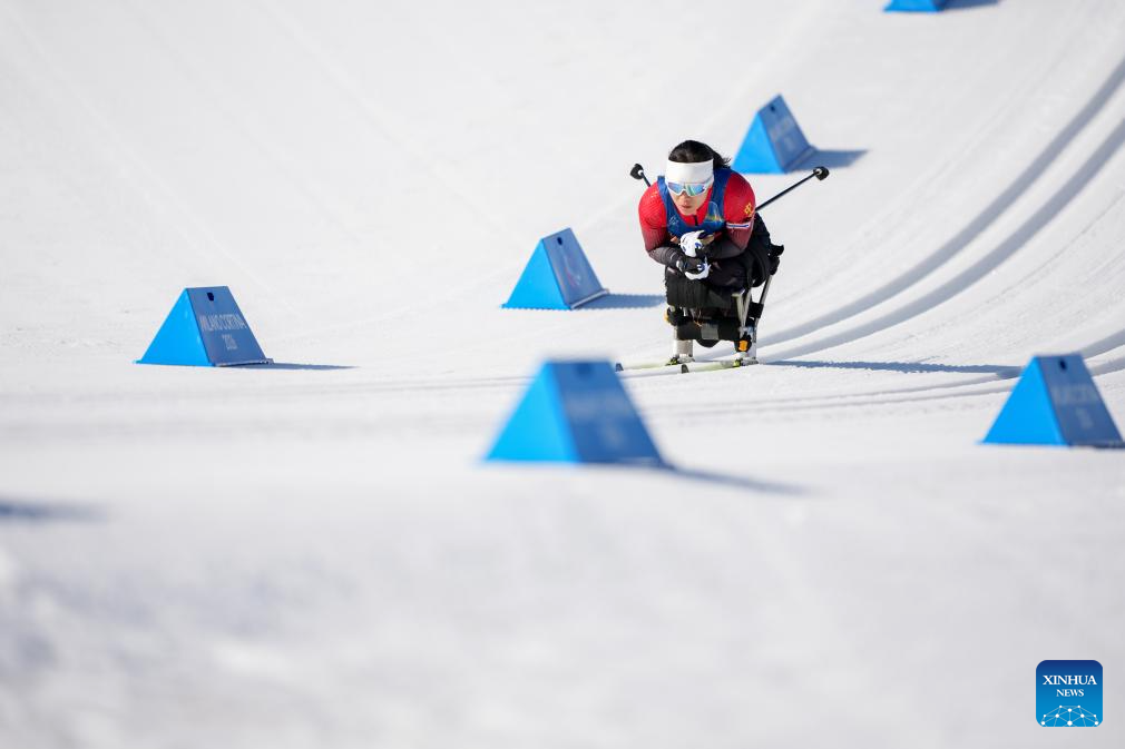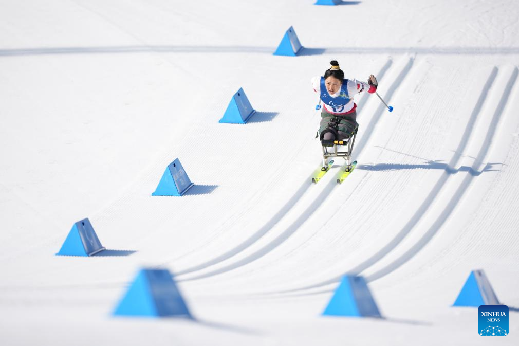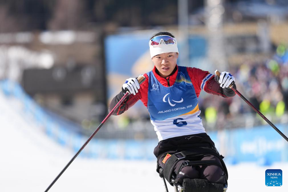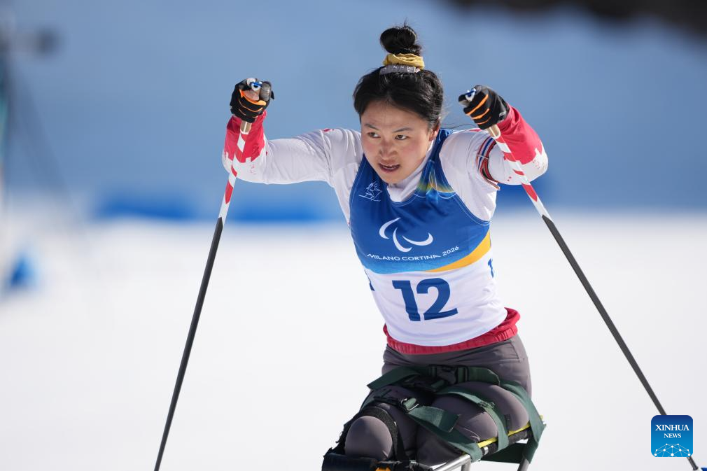 Zhai Yuxin of China competes during the women's individual sitting final of para biathon at the Milan-Cortina 2026 Paralympic Winter Games in Tesero, Italy, March 8, 2026. (Xinhua/Lian Zhen)