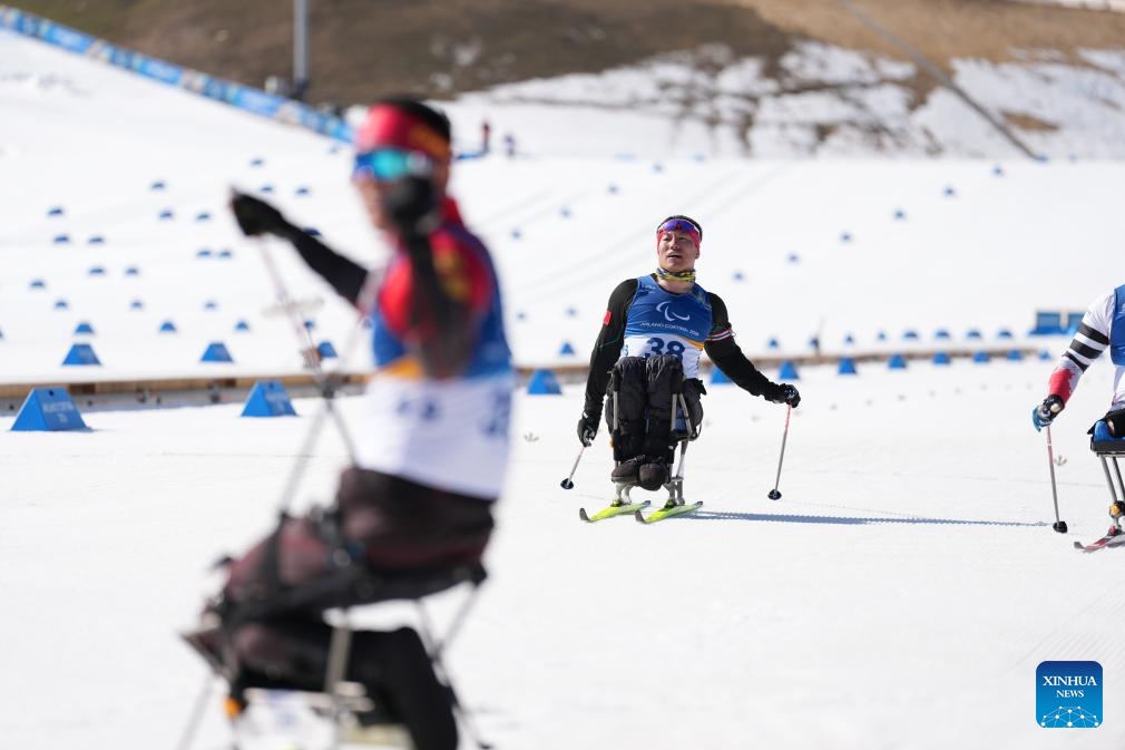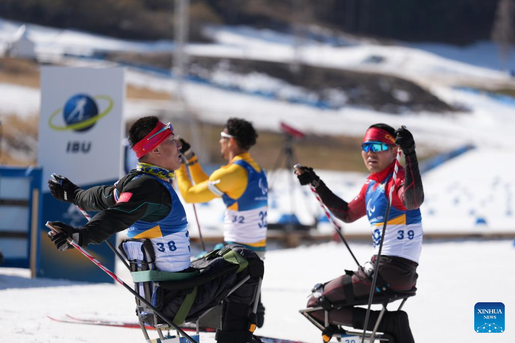 Mao Zhongwu (2nd L) of China competes during the men's individual sitting final of para biathon at the Milan-Cortina 2026 Paralympic Winter Games in Tesero, Italy, March 8, 2026. (Xinhua/Lian Zhen)