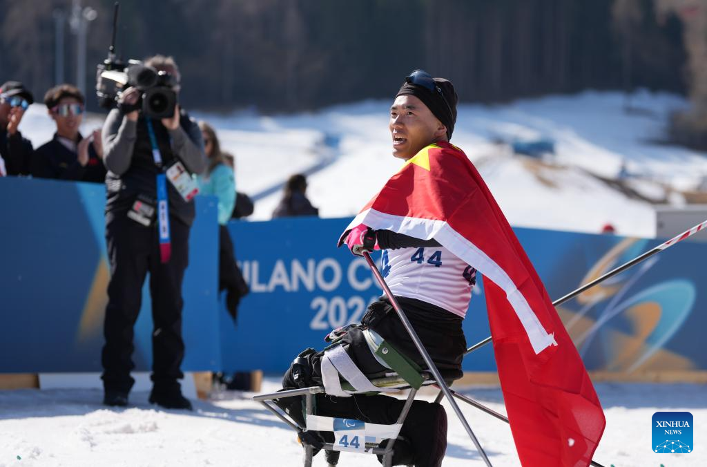 Liu Zixu of China celebrates after the men's individual sitting final of para biathon at the Milan-Cortina 2026 Paralympic Winter Games in Tesero, Italy, March 8, 2026. (Xinhua/Lian Zhen)