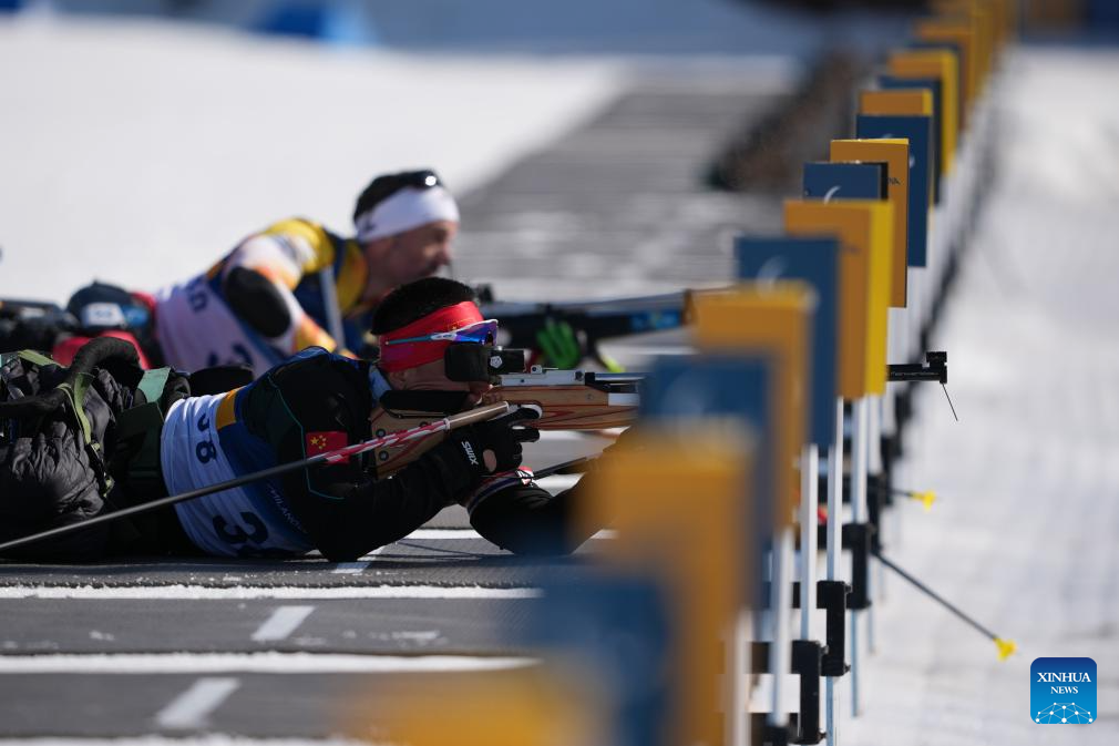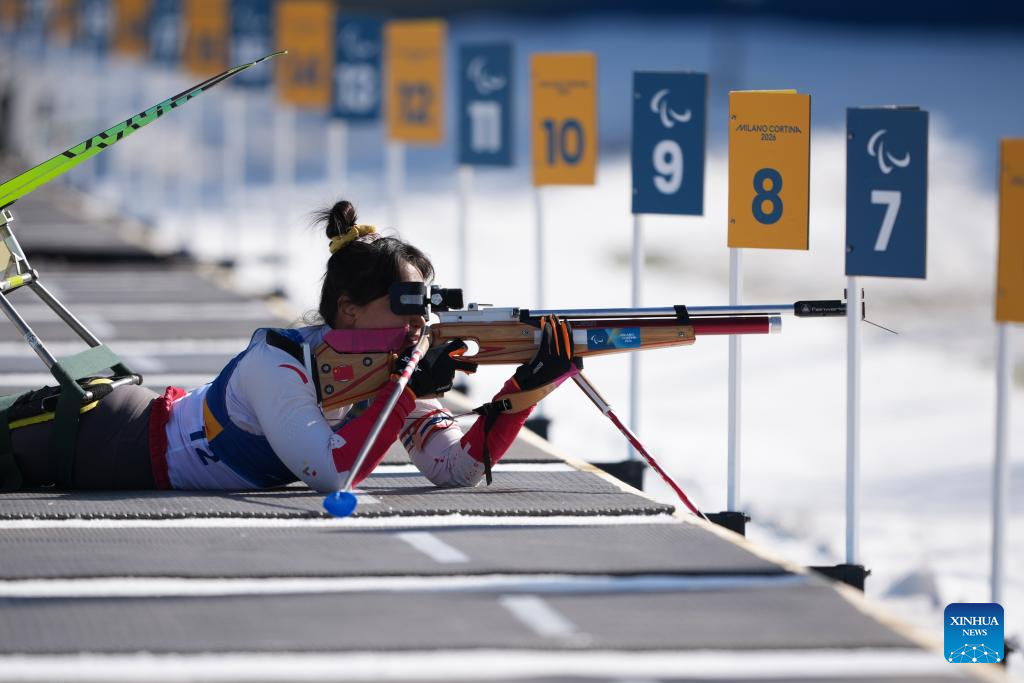 Shan Yilin of China shoots during the women's individual sitting final of para biathon at the Milan-Cortina 2026 Paralympic Winter Games in Tesero, Italy, March 8, 2026. (Xinhua/Lian Zhen)