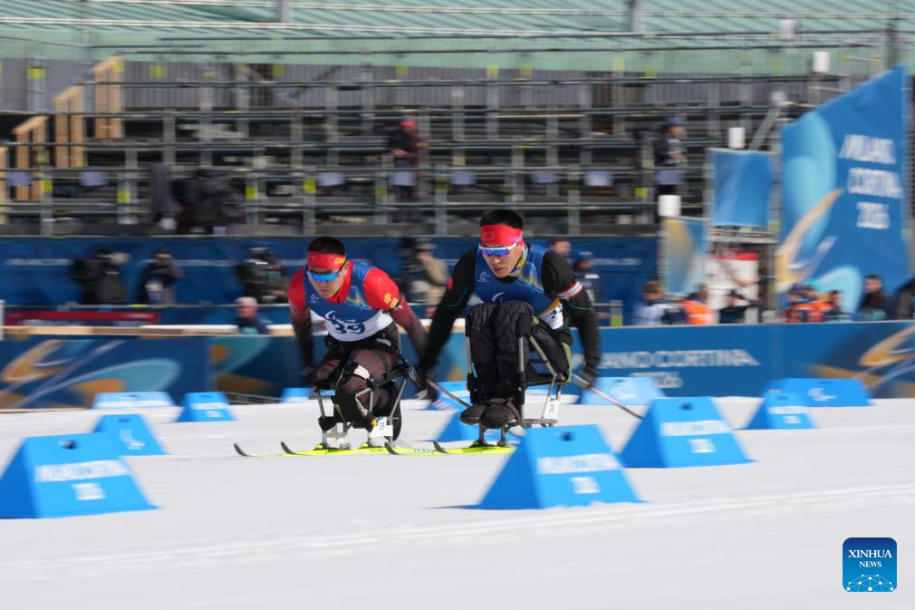 Mao Zhongwu (R) and Wang Tao of China compete during the men's individual sitting final of para biathon at the Milan-Cortina 2026 Paralympic Winter Games in Tesero, Italy, March 8, 2026. (Xinhua/Lian Zhen)