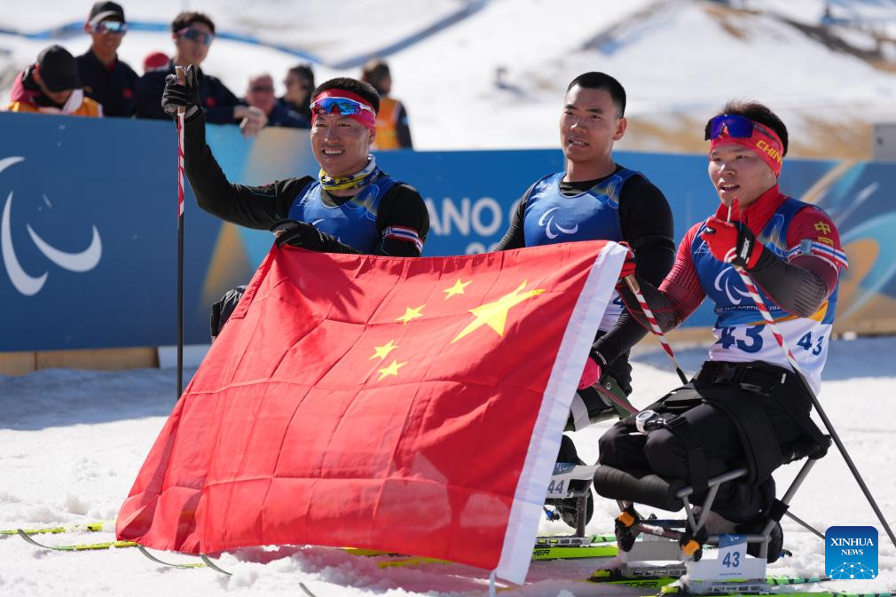 Liu Zixu (R) and Mao Zhongwu of China celebrate after the men's individual sitting final of para biathon at the Milan-Cortina 2026 Paralympic Winter Games in Tesero, Italy, March 8, 2026. (Xinhua/Lian Zhen)