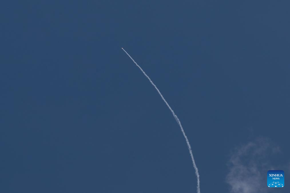 Debris falls after a missile was hit by interceptor missiles launched from Israeli air defense systems over Jerusalem, March 7, 2026. (Xinhua/Chen Junqing)