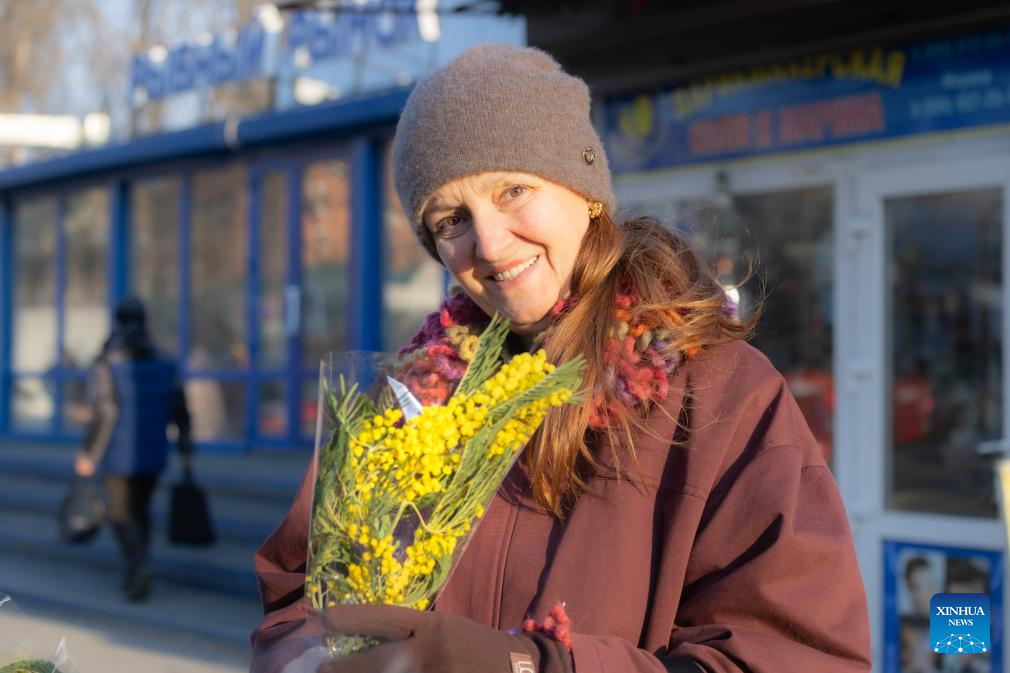 People buy flowers at a flower market in Almaty, Kazakhstan, March 7, 2026. Sunday marks International Women's Day. (Str/Xinhua)