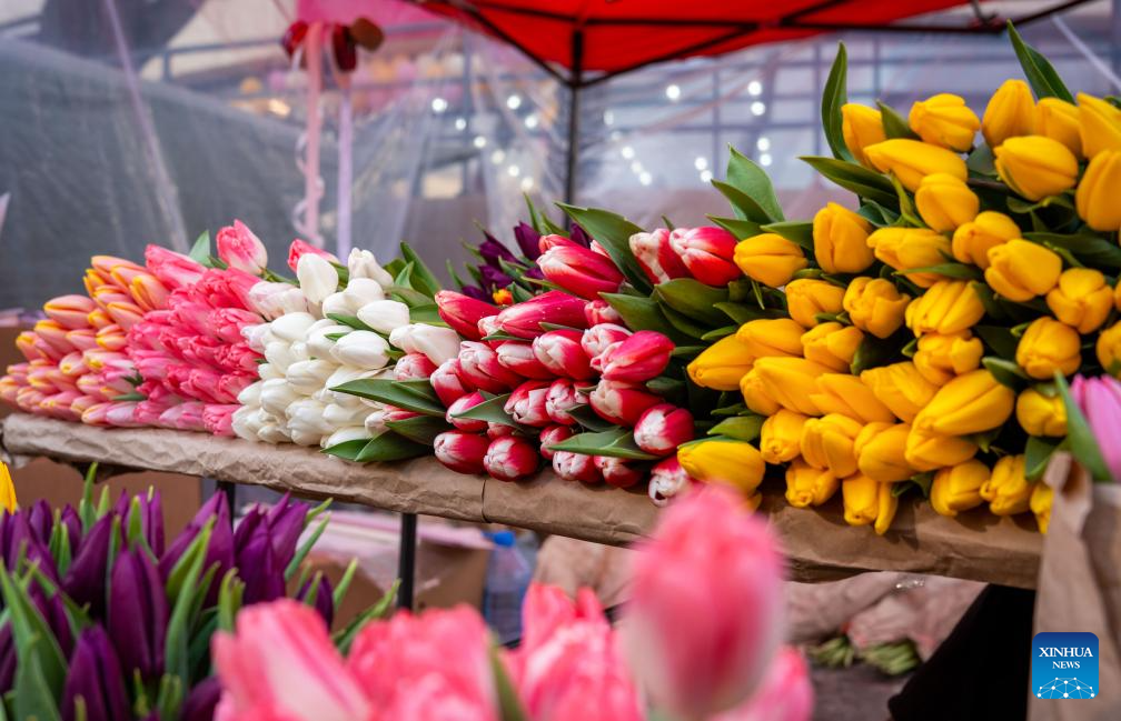 This photo taken on March 7, 2026 shows flowers at a flower market in Almaty, Kazakhstan. Sunday marks International Women's Day. (Str/Xinhua)