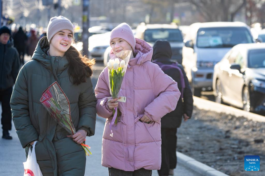 Pedestrians holding flowers walk on the street in Vladivostok, Russia, March 7, 2026. Sunday marks International Women's Day. (Photo by Andrey Matveenko/Xinhua)