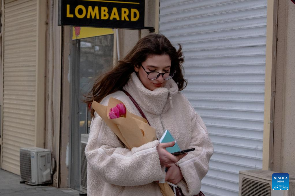 Pedestrians walk past a flower stall in Baku, Azerbaijan, March 7, 2026. Sunday marks International Women's Day. (Xinhua/Chen Junfeng)