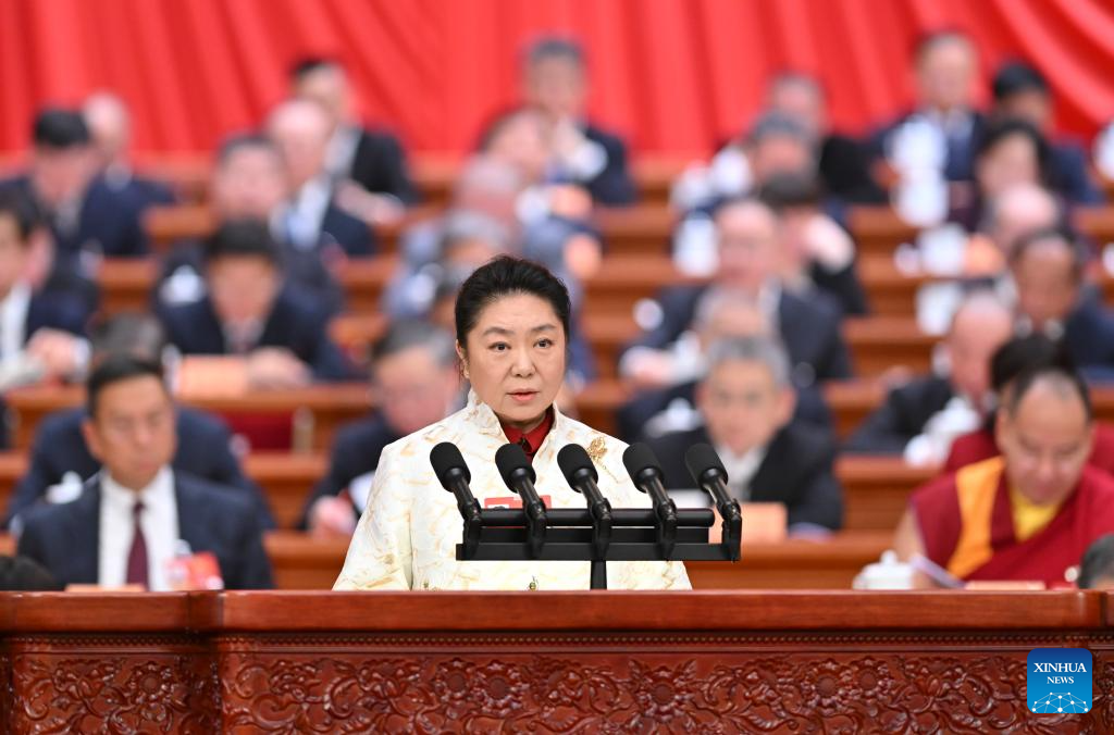 Tian Qinxin, a member of the 14th National Committee of the Chinese People's Political Consultative Conference (CPPCC), speaks at the third plenary meeting of the fourth session of the 14th CPPCC National Committee at the Great Hall of the People in Beijing, capital of China, March 8, 2026. (Xinhua/Zhang Ling)