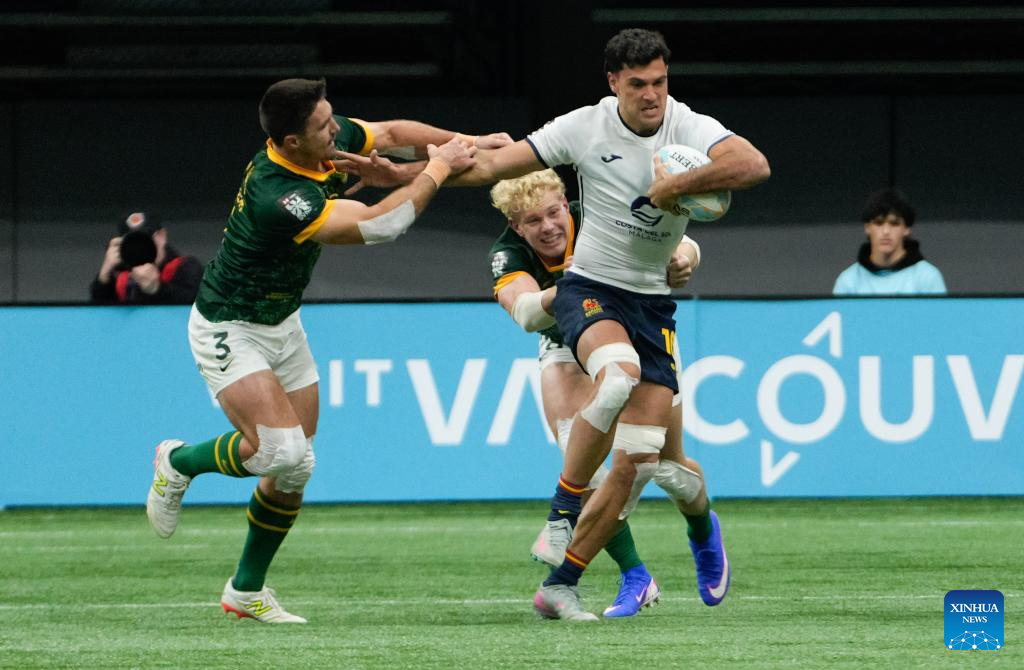 Impi Visser (L) and Grant de Jager (C) of South Africa vie with Manu Moreno of Spain during the Men's Cup Final match between South Africa and Spain at 2026 World Rugby Sevens Series in Vancouver, British Columbia, Canada, on March 8, 2026. (Photo by Liang Sen/Xinhua)