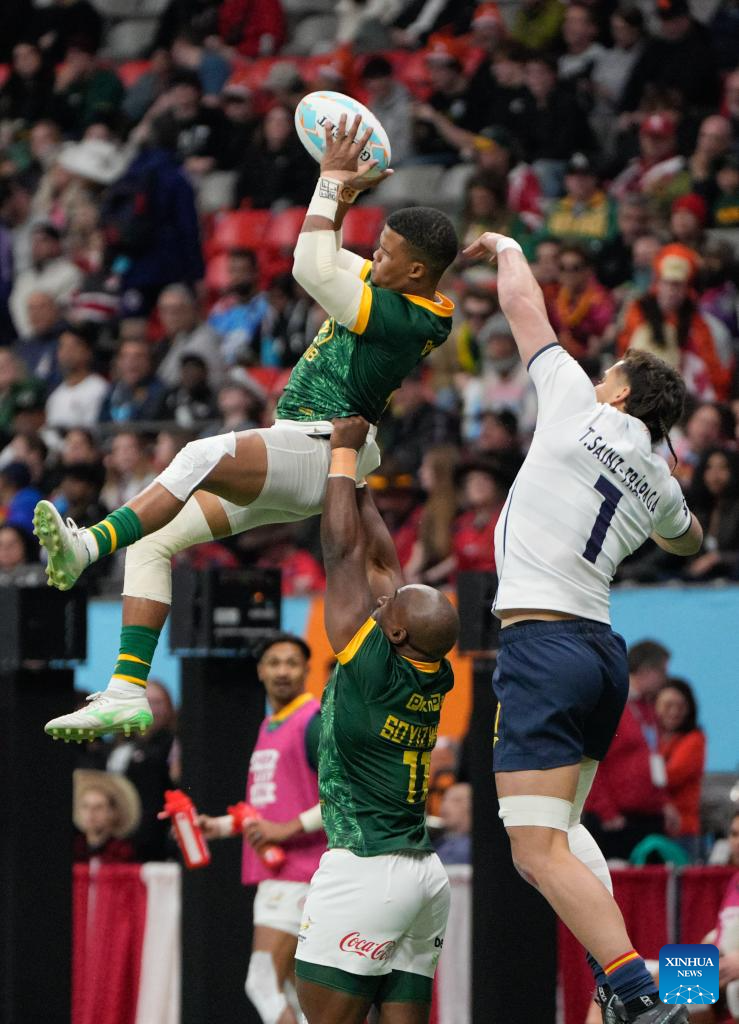 Shilton van Wyk (L) of South Africa scores under the defence of Jeremy Trevithick (C) of Spain during the Men's Cup Final match between South Africa and Spain at 2026 World Rugby Sevens Series in Vancouver, British Columbia, Canada, on March 8, 2026. (Photo by Liang Sen/Xinhua)