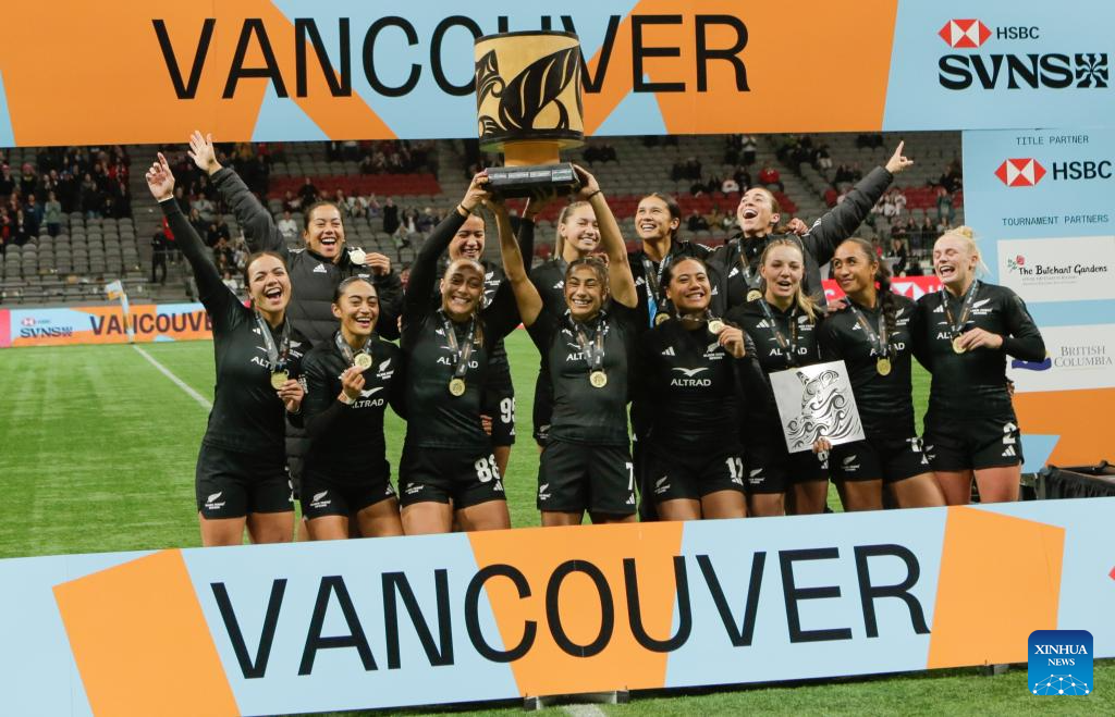 Team New Zealand celebrates with the champion's cup after defeating Australia in the Women's Cup Final match between Australia and New Zealand at 2026 World Rugby Sevens Series in Vancouver, Canada, on March 8, 2026. (Photo by Liang Sen/Xinhua)