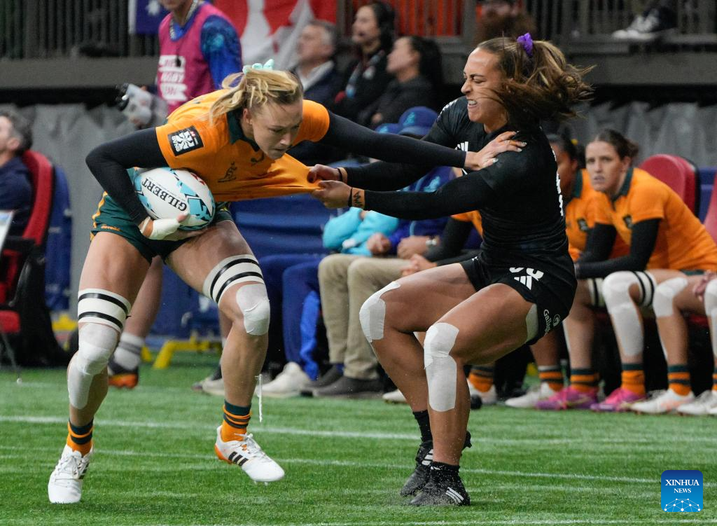 Players compete during the Women's Cup Final match between Australia and New Zealand at 2026 World Rugby Sevens Series in Vancouver, Canada, on March 8, 2026. (Photo by Liang Sen/Xinhua)
