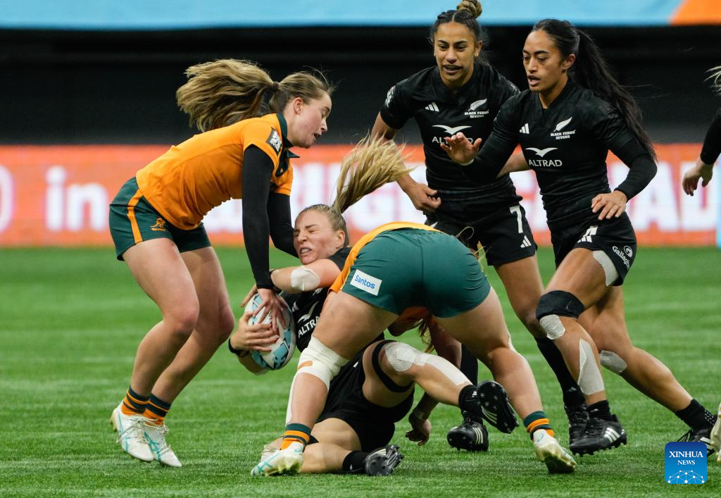 Jaymie Kolose (1st L) of New Zealand tackles Madison Ashby (2nd L) of Australia during the Women's Cup Final match between Australia and New Zealand at 2026 World Rugby Sevens Series in Vancouver, Canada, on March 8, 2026. (Photo by Liang Sen/Xinhua)