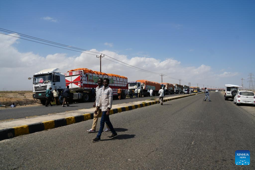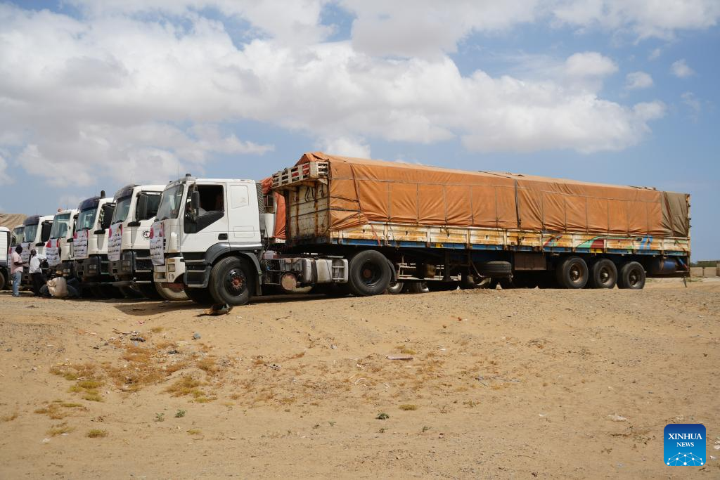This photo taken on March 8, 2026 shows trucks loaded with humanitarian aid in Port Sudan, eastern Sudan. As Sudan's civil war approaches its third anniversary, the United Nations warns that humanitarian needs are rising, while the Sudanese government maintains that food supplies remain under control, raising concerns about the country's future food security. (Photo by Urqia Elzaki/Xinhua)