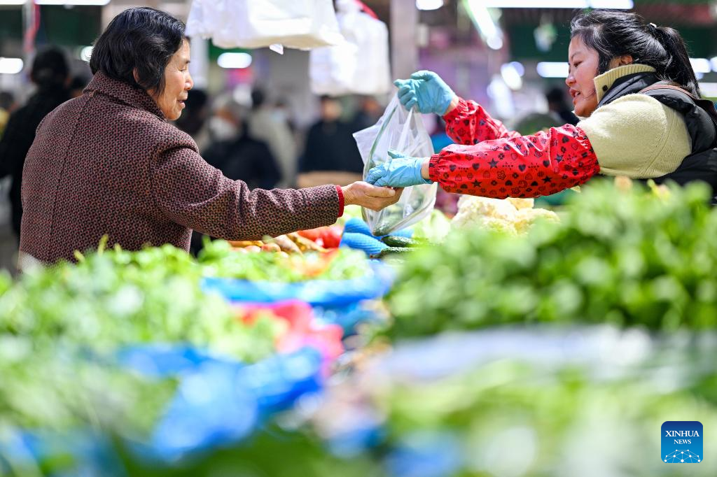 A customer buys vegetables at a market in Yuhuatai District of Nanjing, east China's Jiangsu Province, on March 9, 2026. China's consumer price index (CPI), a main gauge of inflation, rose 1.3 percent year on year last month, driven by the effects of the Spring Festival holiday, official data showed on Monday.