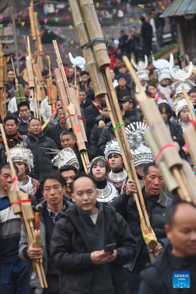 A child plays Lusheng during the "pohui" festival in a scenic area of Rongshui Miao Autonomous County, Liuzhou City, south China's Guangxi Zhuang Autonomous Region, March 8, 2026. (Photo by Zheng Changhao/Xinhua)
