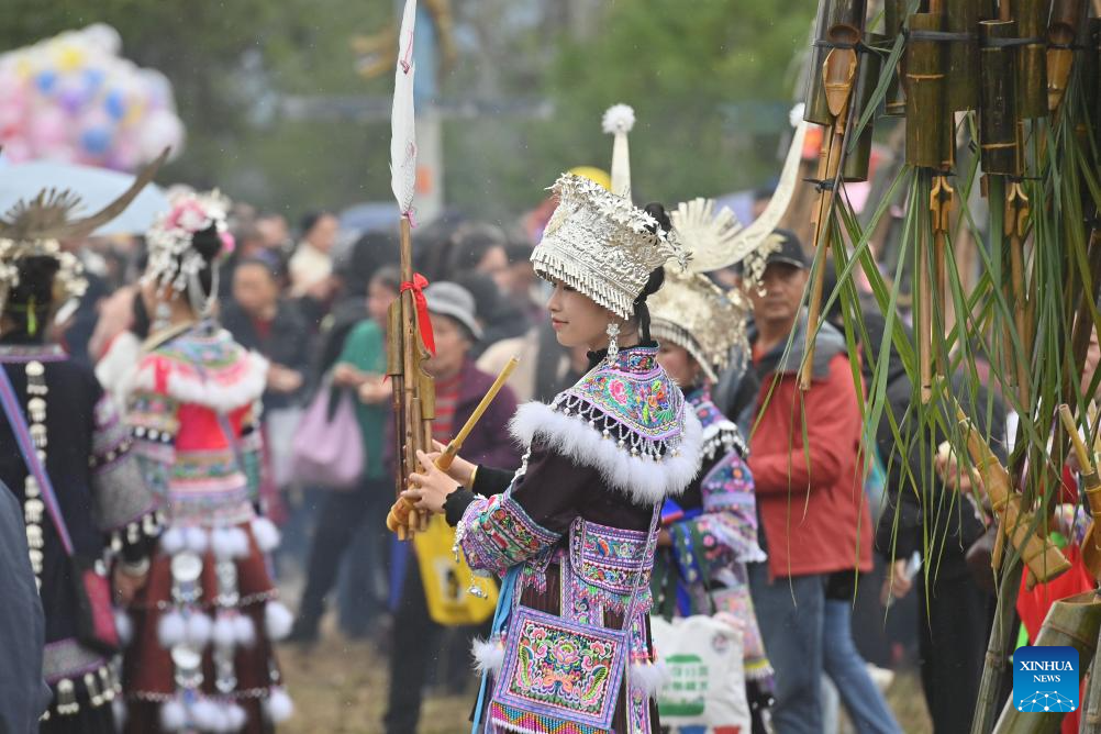 People attend a fair celebrating the "pohui" festival in a Miao ethnic village of Rongshui Miao Autonomous County, Liuzhou City, south China's Guangxi Zhuang Autonomous Region, March 7, 2026.