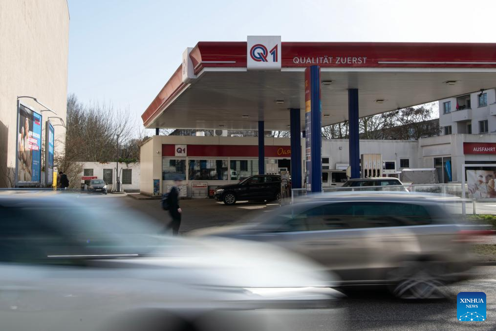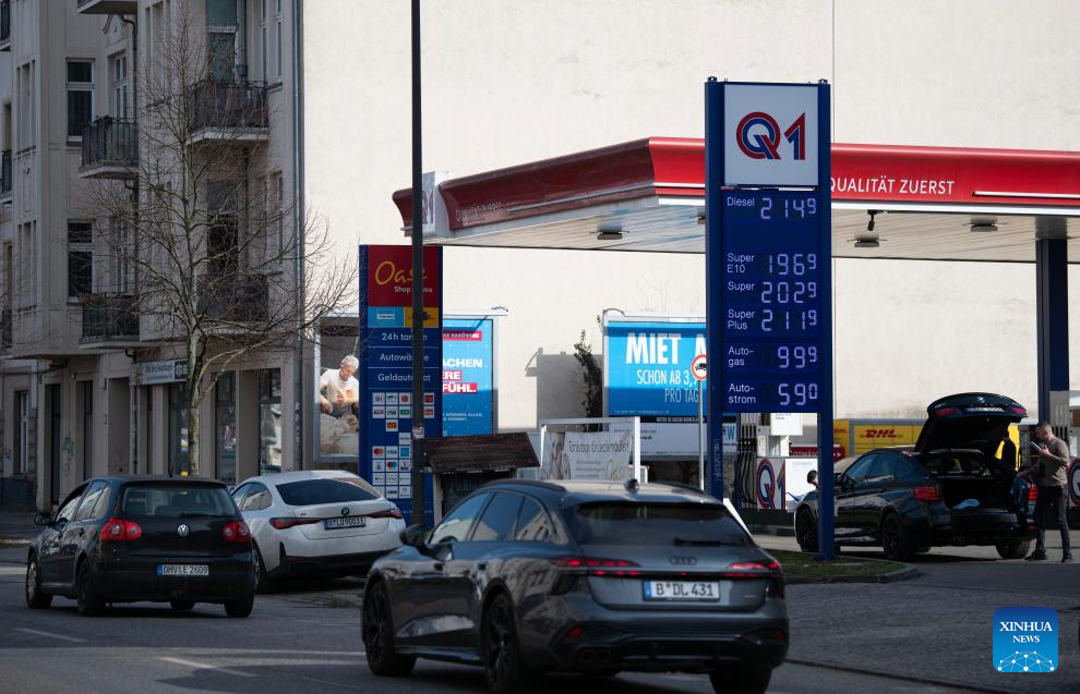 Vehicles move past a gas station in Berlin, Germany, March 9, 2026. The European Union (EU) is closely monitoring rising energy prices amid disruptions linked to the war in the Middle East, a European Commission spokesperson said on Monday. (Xinhua/Zhang Haofu)