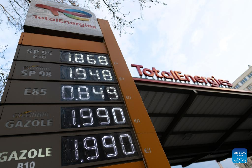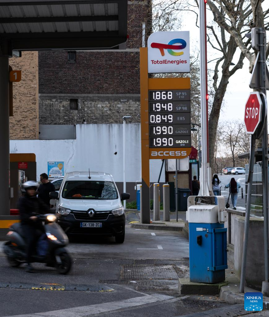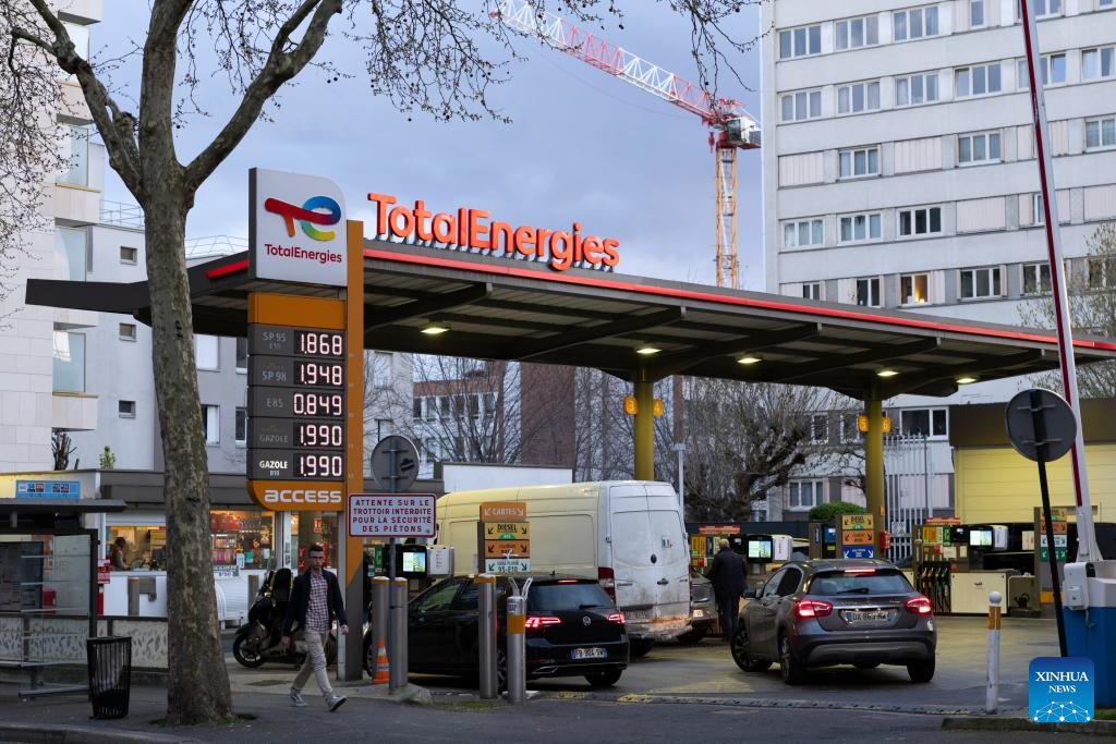 Vehicles refuel at a gas station in Paris, France, on March 9, 2026. The European Union (EU) is closely monitoring rising energy prices amid disruptions linked to the war in the Middle East, a European Commission spokesperson said on Monday. (Xinhua/Wu Huiwo)