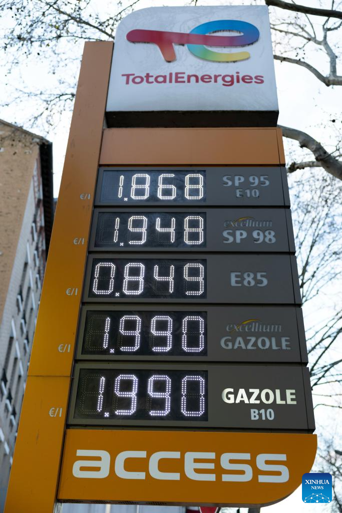 Photo taken on March 9, 2026 shows a price board at a gas station in Paris, France. The European Union (EU) is closely monitoring rising energy prices amid disruptions linked to the war in the Middle East, a European Commission spokesperson said on Monday. (Xinhua/Wu Huiwo)