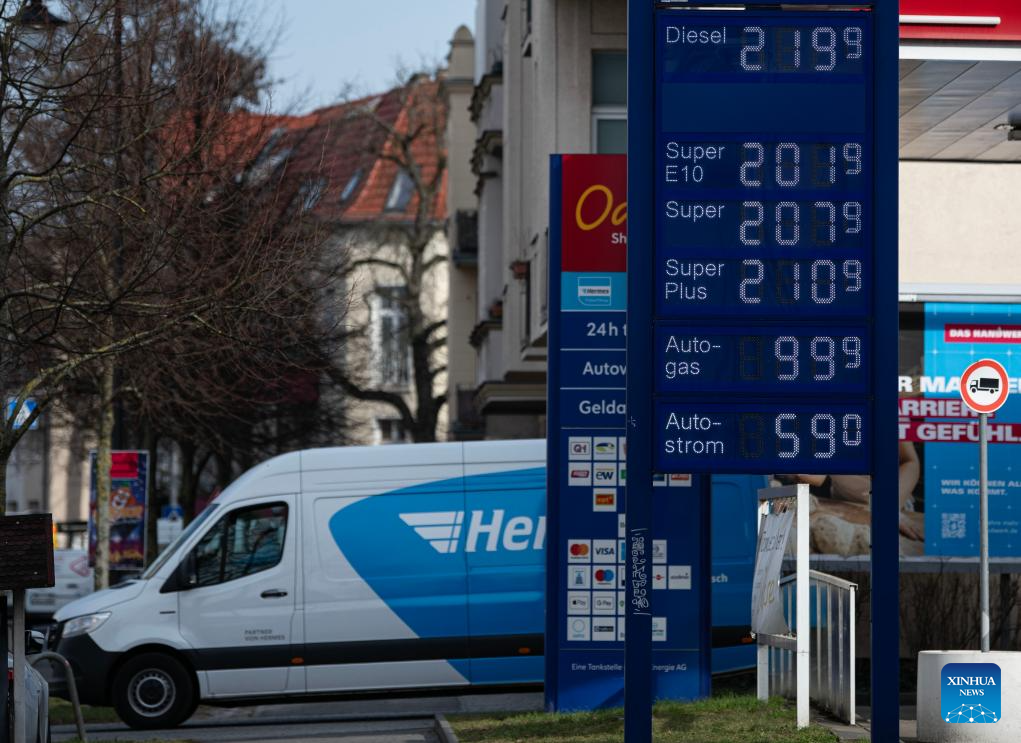 A vehicle leaves a gas station in Berlin, Germany, March 9, 2026. The European Union (EU) is closely monitoring rising energy prices amid disruptions linked to the war in the Middle East, a European Commission spokesperson said on Monday. (Xinhua/Zhang Haofu)